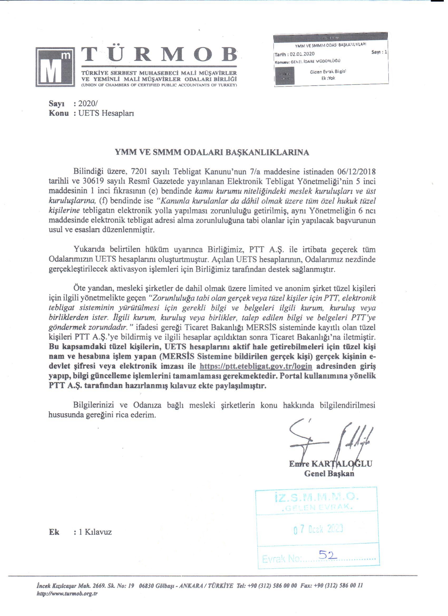 UETS Hesapları İle İlgili TÜRMOB Duyurusu 20 Ocak 2020 Pazartesi4918 Ulusal Elektronik Tebligat Sistemi ile ilgili TÜRMOB duyurusu için lütfen tıklayınız.UETS klavuz için lütfen tıklayınız.
