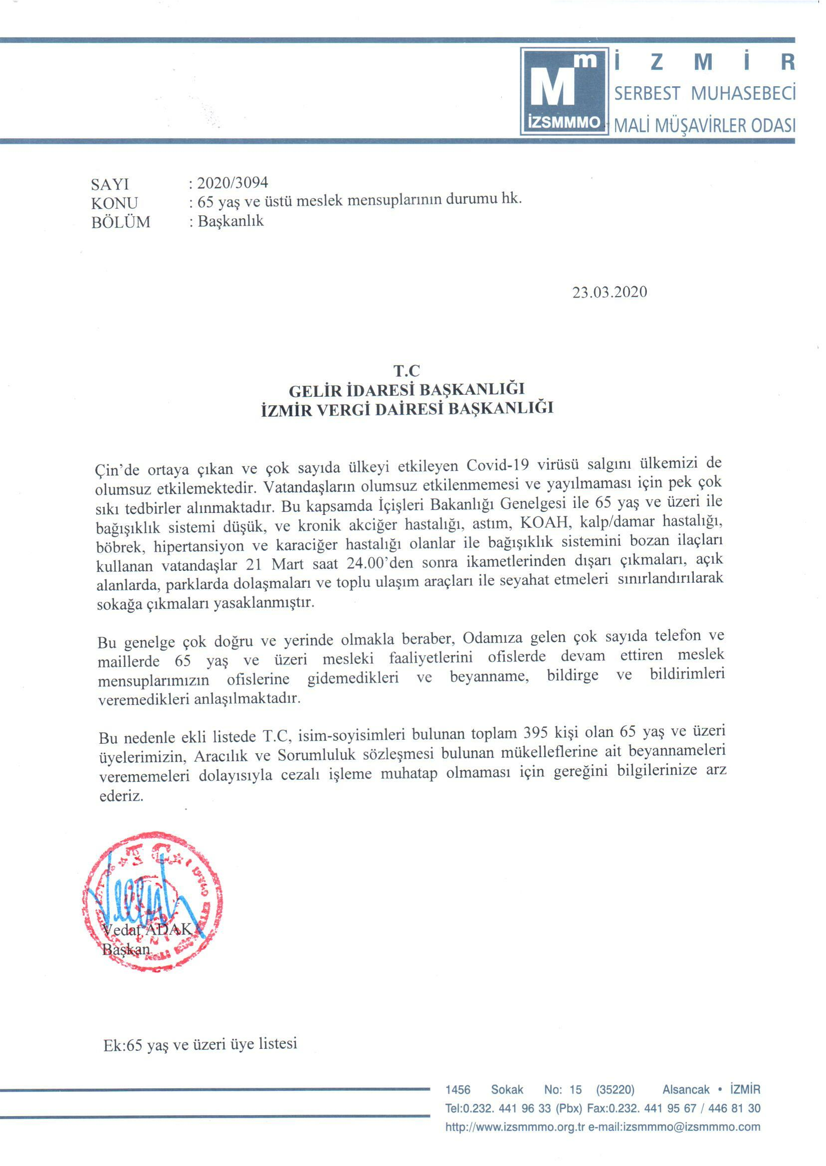 65 Yaş ve Üzeri Üyelerimizin Durumu Hakkında Yazımız 23 Mart 2020 Pazartesi3125 65 yaş ve üzeri üyelerimizin, Aracılık ve Sorumluluk sözleşmesi bulunan mükelleflerine ait beyannameleri verememeleri dolayısıyla cezalı işleme muhatap olmaması ile ilgili İzmir Vergi Dairesi Başkanlığı'na talebimizi içeren yazımız ektedir.