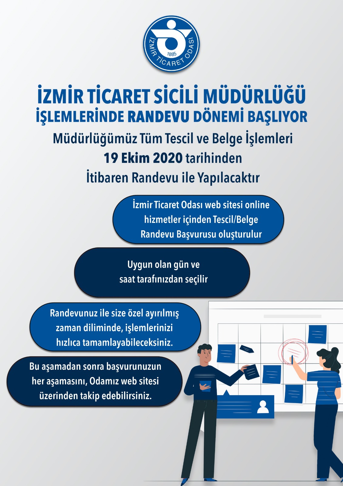 İzmir Ticaret Sicil Müdürlüğü tarafından 19 Ekim 2020 tarihinden itibaren tüm tescil ve belge işlemleri randevu ile yapılacaktır.