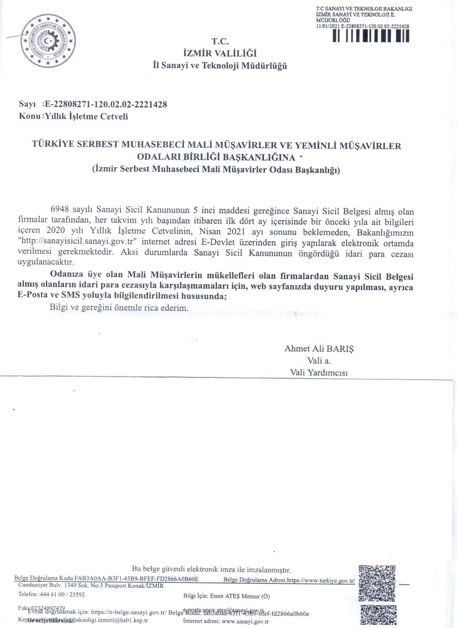 İl Sanayi ve Teknoloji Müdürlüğü "Yıllık İşletme Cetveli" Duyurusu
