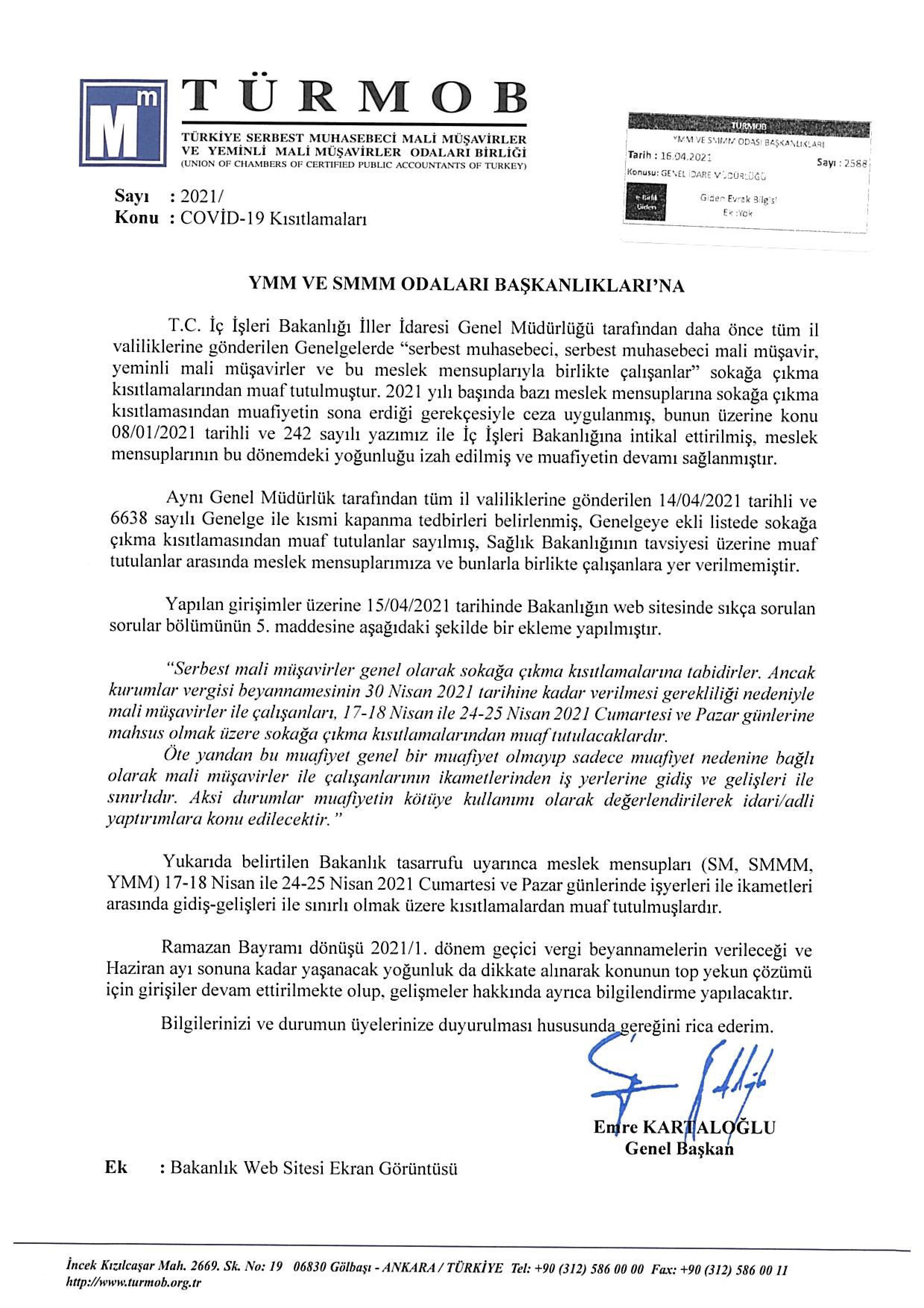 14.04.2021 tarihinde yayınlanan Genelge ile sokağa çıkma kısıtlamalarından 17-18 Nisan 2021 ile 24-25 Nisan 2021 Cumartesi ve Pazar tarihleri dışında muaf tutulmayan meslek mensuplarımızın Ramazan Bayramı dönüşü 2021/1. Dönem geçici vergi beyannamelerin verileceği ve Haziran ayı sonuna kadar yaşanacak yoğunlukta dikkate alınarak konunun top yekün çözümü için girişimlerin devam ettiği bildirilmiştir.