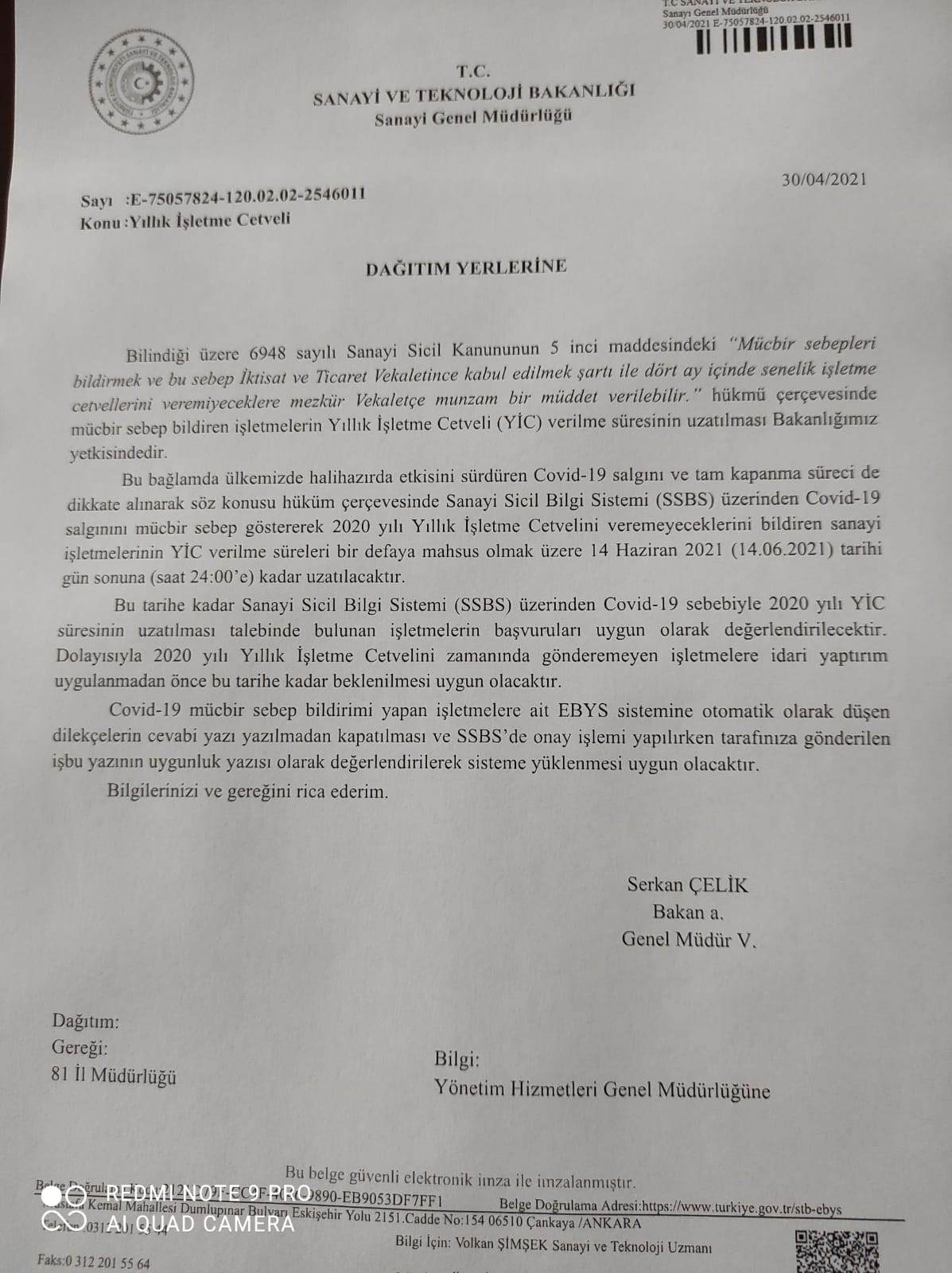 İlgi yazı ile Covid-19 salgını ve tam kapanma süreci de dikkate alınarak, Sanayi Sicil Bilgi Sistemi (SSBS) üzerinden Covid-19 salgınını mücbir sebep göstererek 2020 yılı Yıllık İşletme Cetvelini veremeyeceklerini bildiren sanayi işletmelerinin YİC verilme süreleri bir defaya mahsus olmak üzere 14 Haziran 2021 gün sonuna kadar uzatılmıştır.