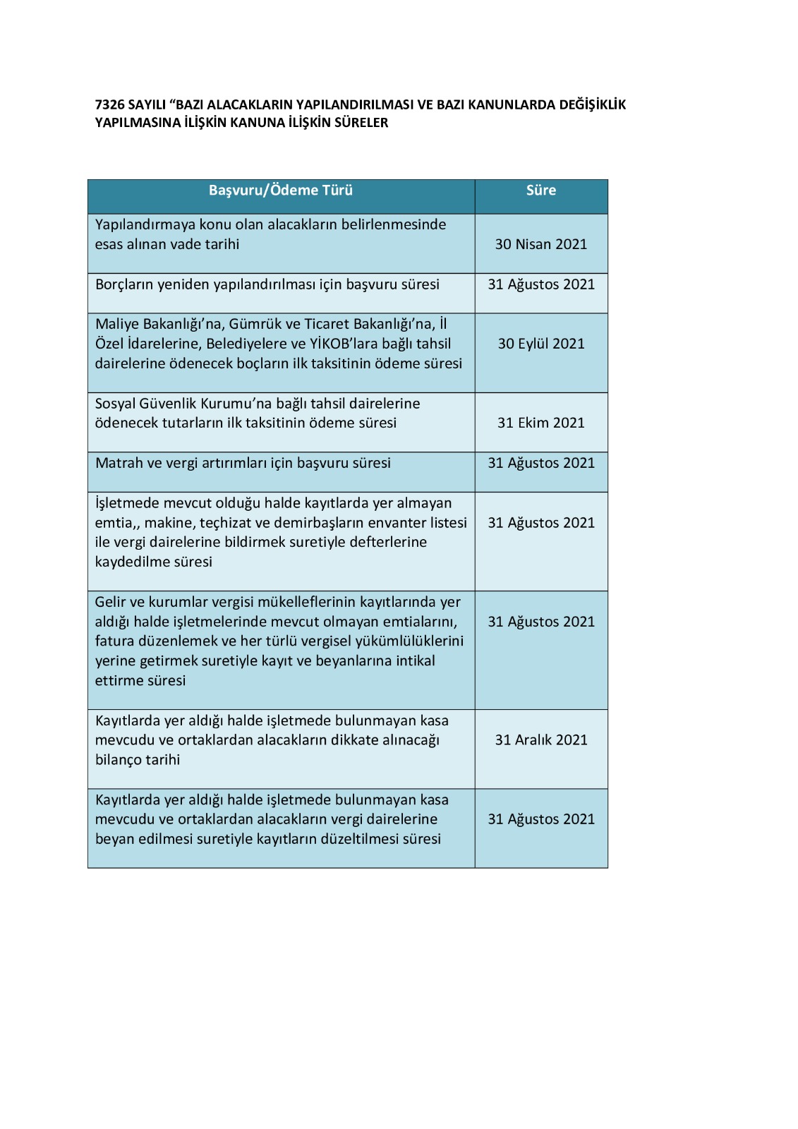 7326 Sayılı Bazı Alacakların Yapılandırılması Kanunu: Süreler