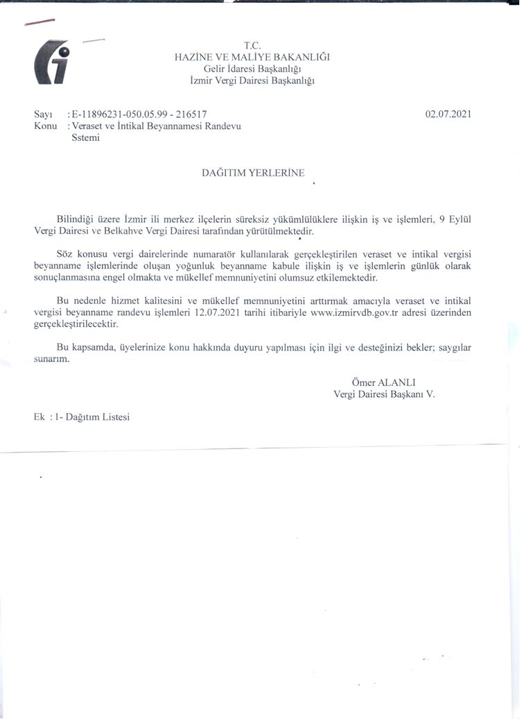 Veraset ve intikal vergisi beyanname randevu işlemleri 12.07.2021 tarihinden itibariyle www.izmirvdb.gov.tr adresi üzerinden gerçekleştirilecektir.