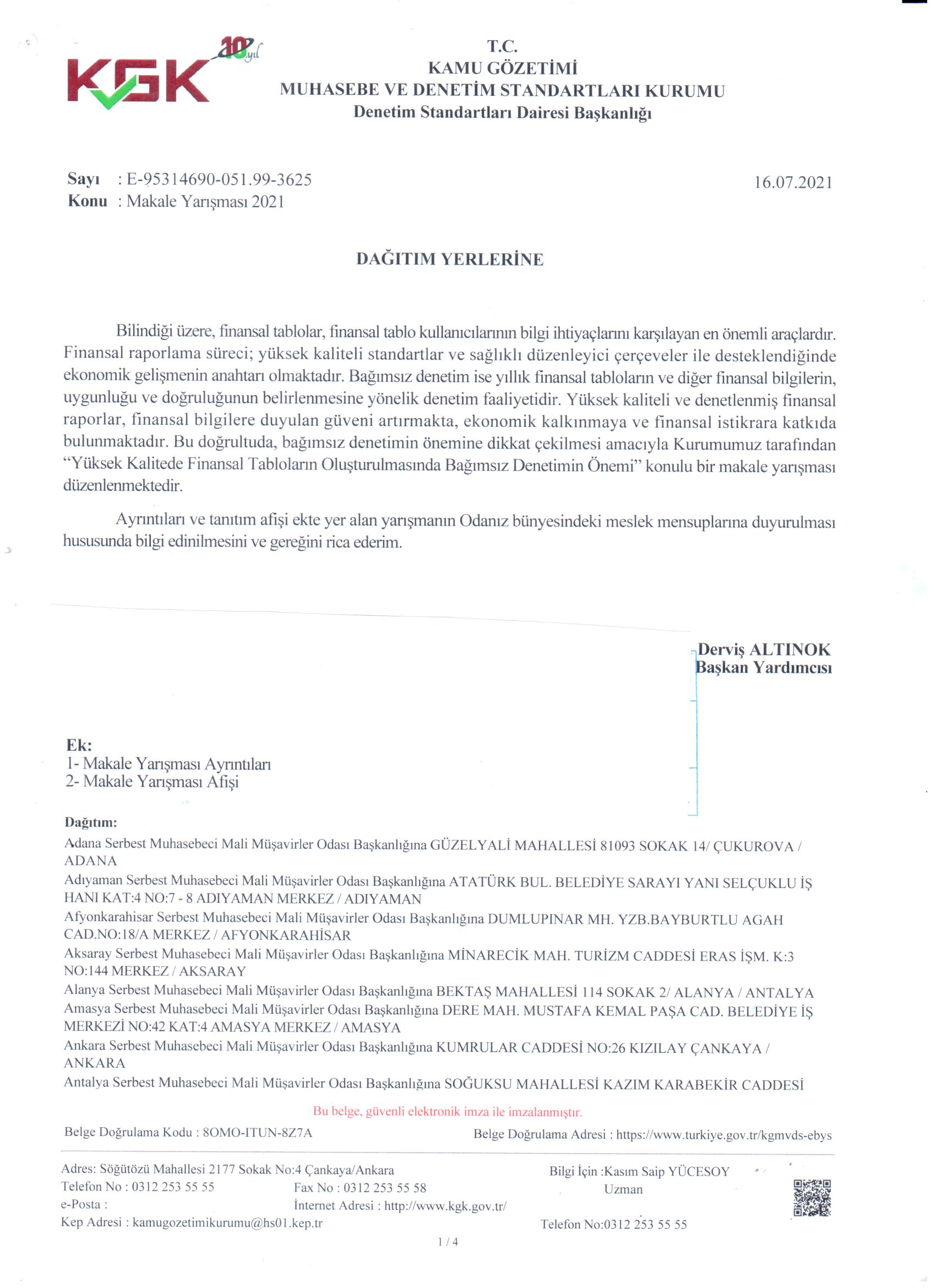 KGK "Yüksek Kalitede Finansal Tabloların Oluşturulmasında Bağımsız Denetimin Önemi" Makale Yarışması 6 Ağustos 2021 Cuma2088 Makale yarışması katılım koşulları için tıklayınız.