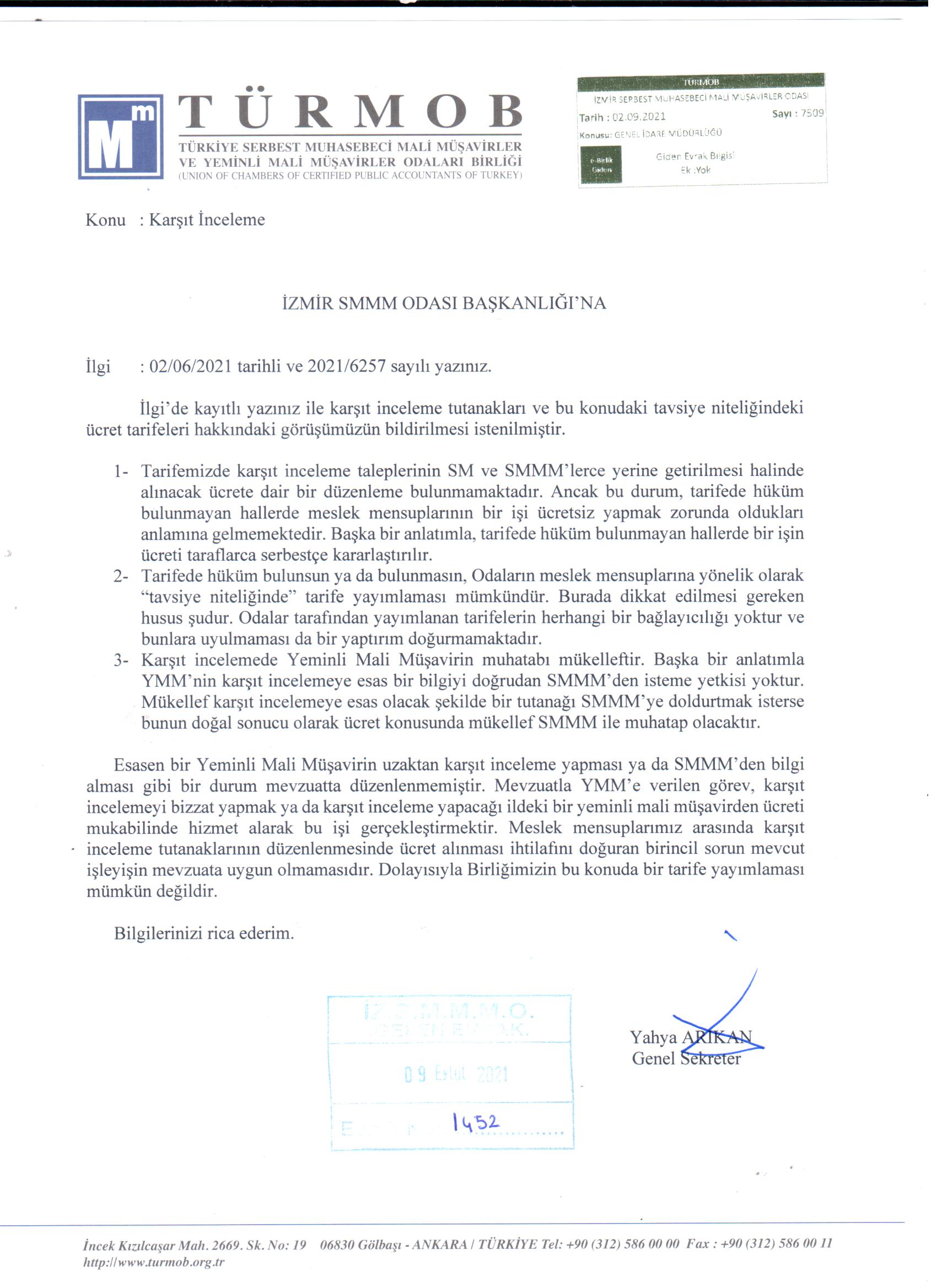 "Karşıt İnceleme" TÜRMOB Görüş 15 Eylül 2021 Çarşamba5566 SMMM'ler tarafından düzenlenen karşıt inceleme tutanağı hazırlama hizmeti ücreti konusunda TÜRMOB tarafından Odamıza bildirilen görüş bilgilerinize sunulmuştur.