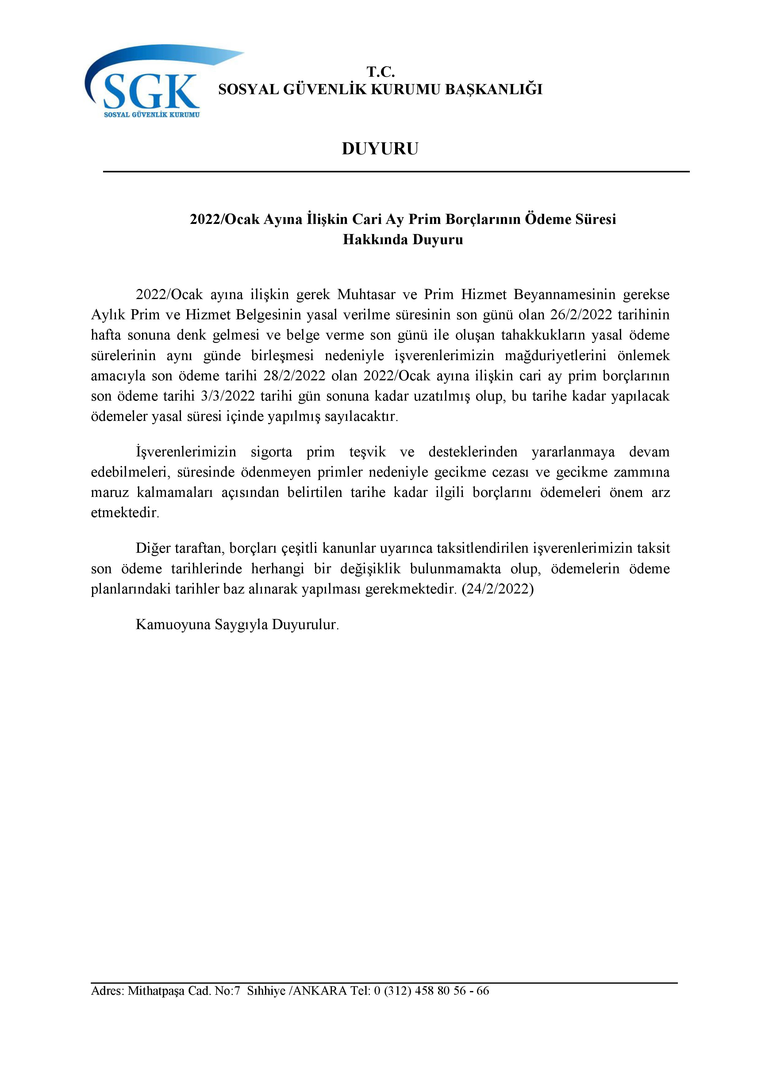 2022 Yılı Ocak Ayı Sigorta Primleri Ödeme Süresi 03.03.2022 Tarihine Uzatıldı