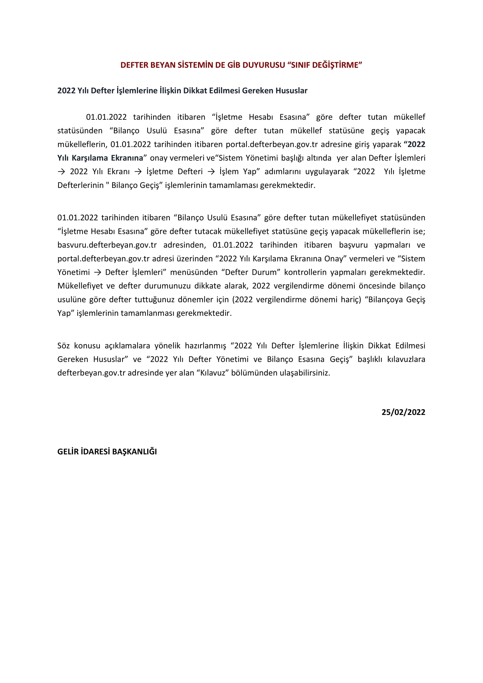 Defter Beyan Sisteminde GİB Duyurusu "Sınıf Değiştirme"