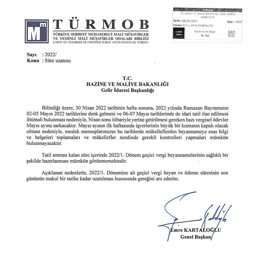 2022/1.Dönem Geçici Vergi Beyan ve Ödeme Sürelerinin Uzatılması Talebi