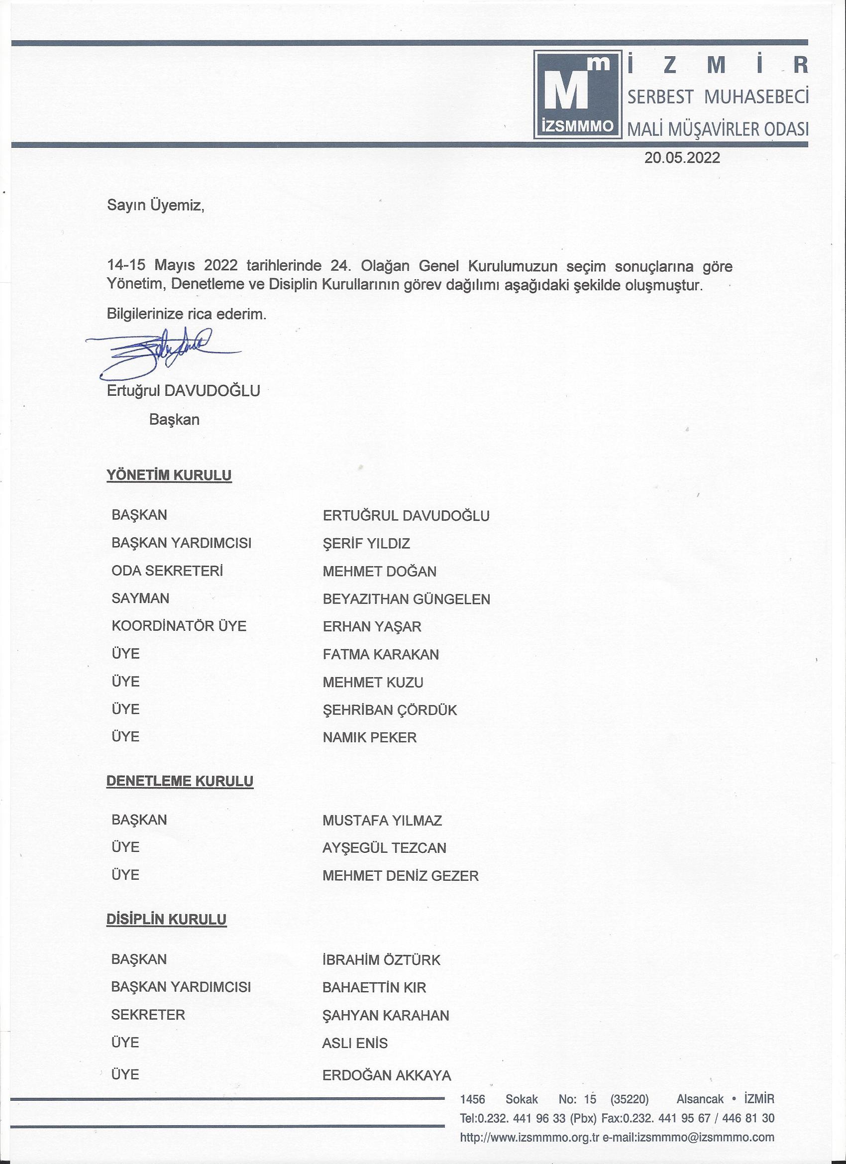 24. Olağan Genel Kurulumuzun Seçim Sonuçlarına Göre Görev Dağılımı
