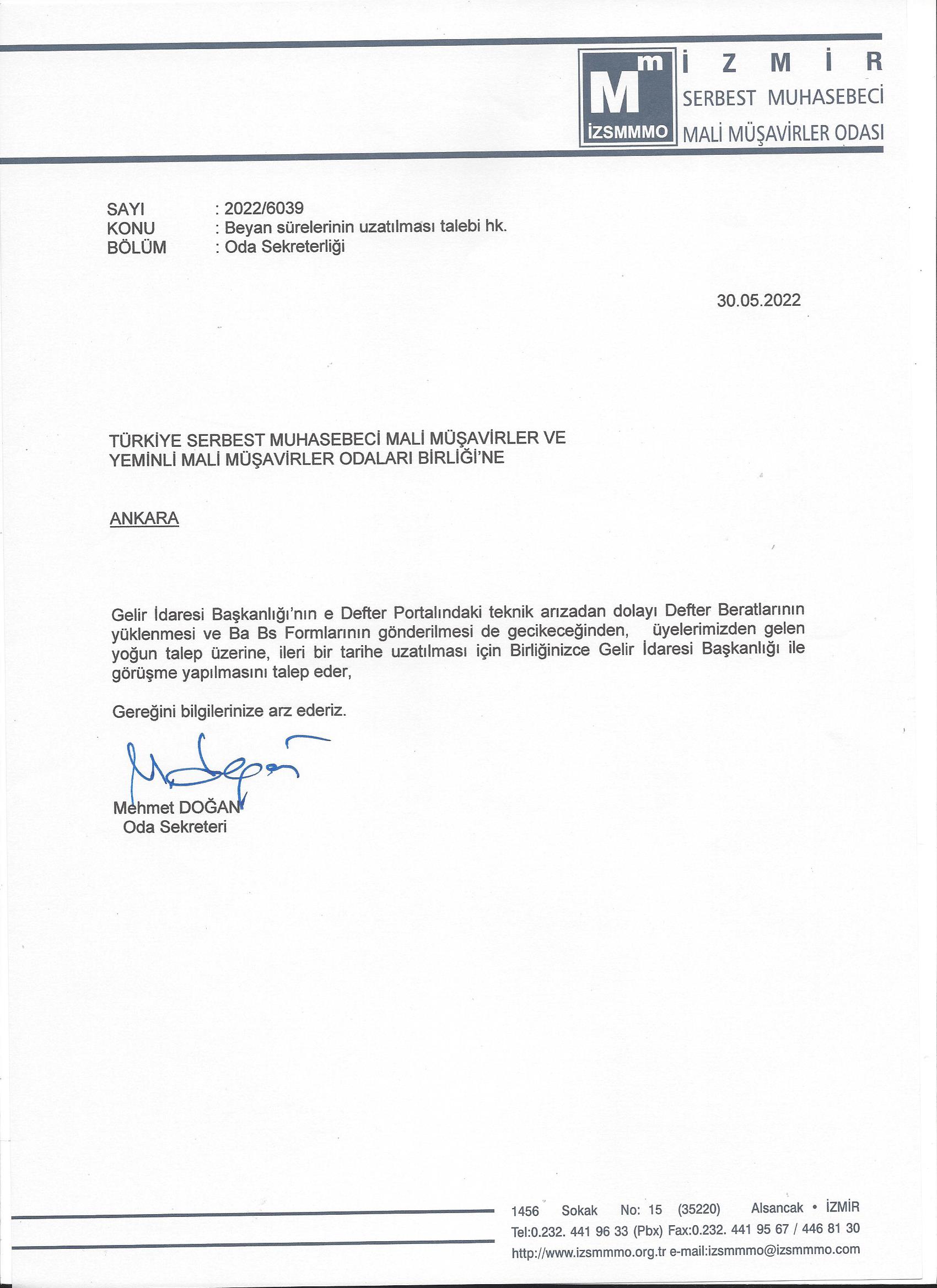 GİB e Defter Portalı Teknik Arıza ile ilgili TÜRMOB'a Gönderilen Yazımız