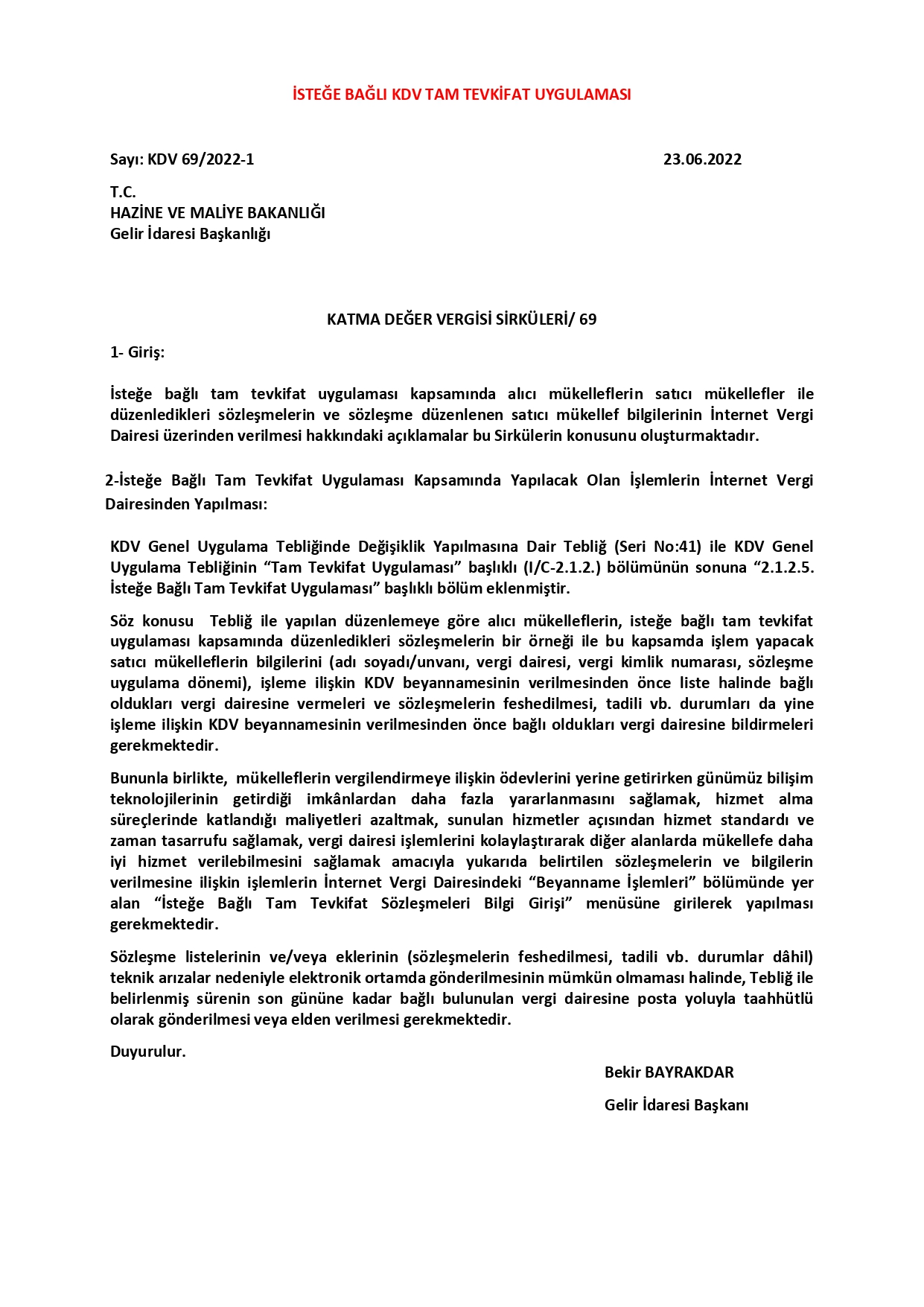 İsteğe Bağlı KDV Tam Tevkifat Uygulaması (KDV Sirküleri/69)