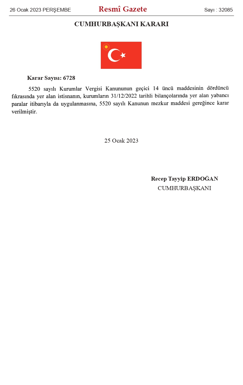 31.12.2022 Tarihli Bilançoda Yer Alan Yabancı Paralar için Kur Korumalı Mevduat Uygulaması İstisnası'nın Devamına İlişkin Karar yayımlandı. 27 Ocak 2023 Cuma1309