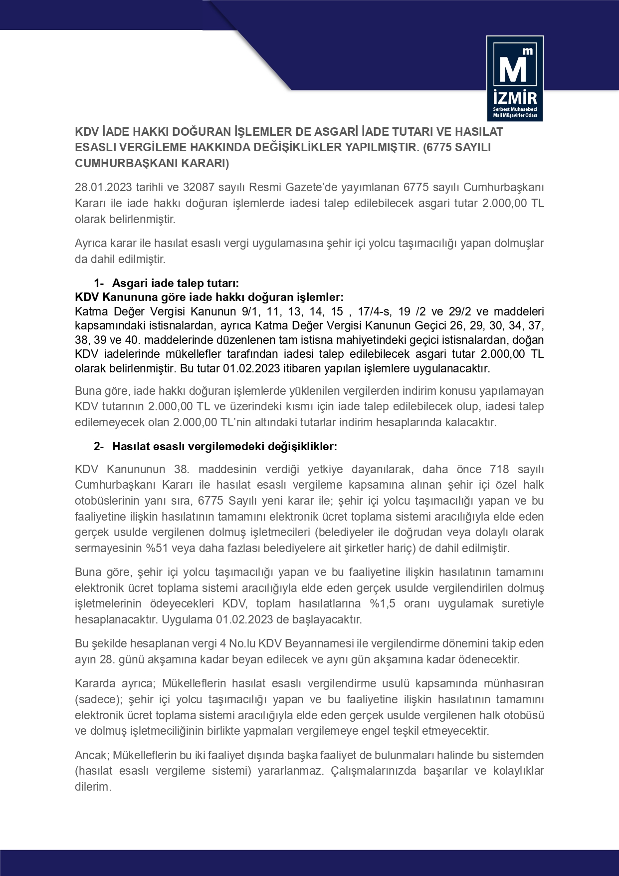 KDV İade Hakkı Doğuran İşlemlerde Asgari İade Tutarı Ve Hasılat Esaslı Vergileme Hakkında Değişiklikler Yapılmıştır 7 Şubat 2023 Salı1578 –– Katma Değer Vergisinin İade Talebinde Bulunulabilecek Asgari Tutarının Belirlenmesi ile 6/2/2019 Tarihli ve 718 Sayılı Cumhurbaşkanı Kararının Eki Kararda Değişiklik Yapılmasına İlişkin Ekli Kararın Yürürlüğe Konulması Hakkında Karar (Karar Sayısı: 6775)