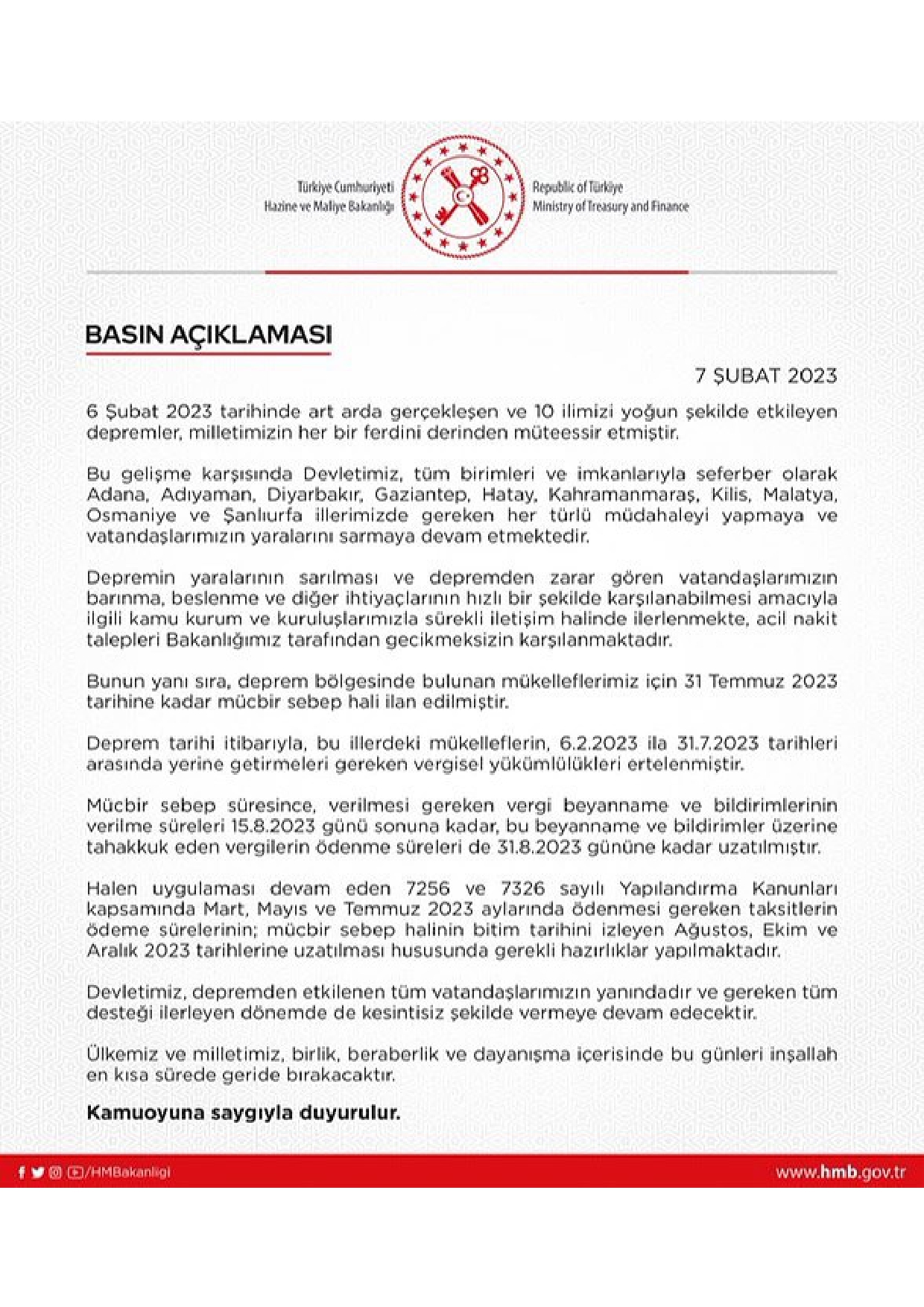 Hazine ve Maliye Bakanlığı, Deprem Bölgesinde Bulunan Mükellefler için 31 Temmuz 2023 Tarihine kadar Mücbir Sebep Hali ilan etti. 9 Şubat 2023 Perşembe1837