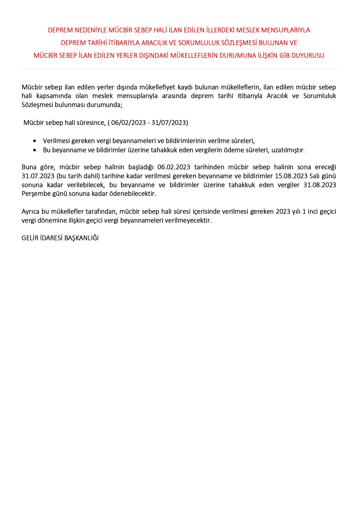 Deprem Nedeniyle Mücbir Sebep Hali İlan Edilen İllerdeki Meslek Mensuplarıyla Deprem Tarihi İtibarıyla Aracılık Ve Sorumluluk Sözleşmesi Bulunan Ve Mücbir Sebep İlan Edilen Yerler Dışındaki Mükelleflerin Durumuna İlişkin GİB Duyurusu 17 Şubat 2023 Cuma1408
