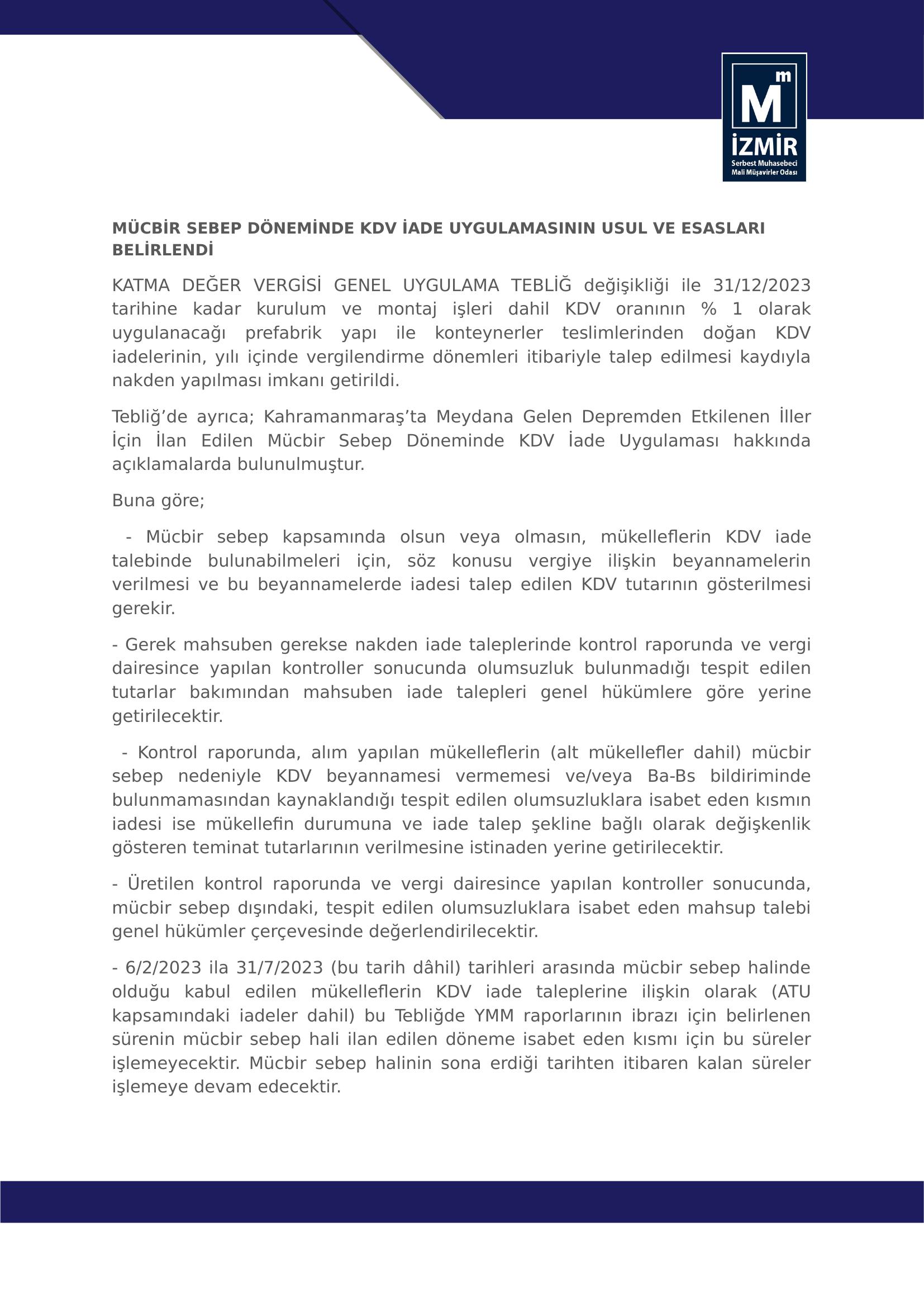 Mücbir Sebep Döneminde KDV İade Uygulamasının Usul Ve Esasları Belirlendi 1 Mart 2023 Çarşamba1302 TÜRMOB Sirküler için tıklayınız.–– Katma Değer Vergisi Genel Uygulama Tebliğinde Değişiklik Yapılmasına Dair Tebliğ (Seri No: 45)