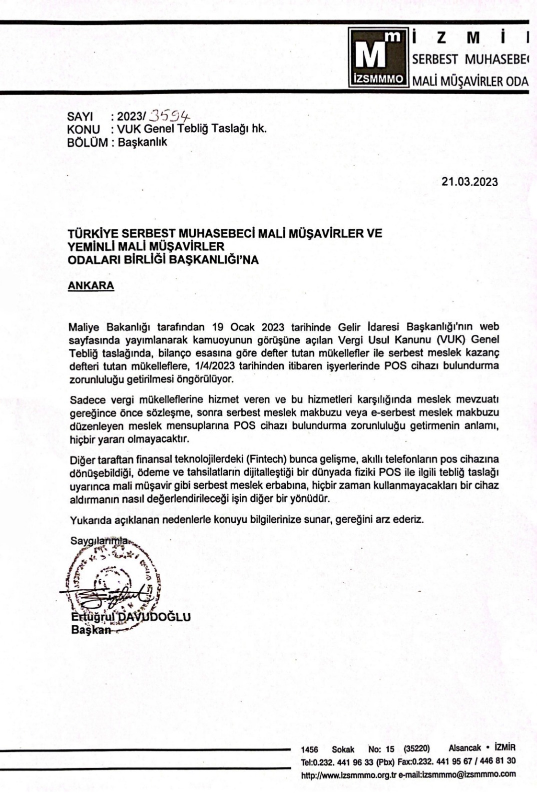 Mali Müşavirler İçin Fiziki Pos Zorunluluğu ile İlgili TÜRMOB'a Gönderilen Yazımız 24 Mart 2023 Cuma1544