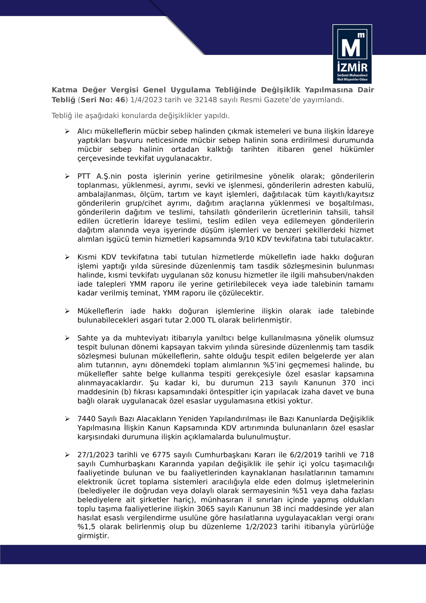 Katma Değer Vergisi Genel Uygulama Tebliği (Seri No: 46) 7 Nisan 2023 Cuma1289 TÜRMOB Sirküler için tıklayınız.–– Katma Değer Vergisi Genel Uygulama Tebliğinde Değişiklik Yapılmasına Dair Tebliğ (Seri No: 46)