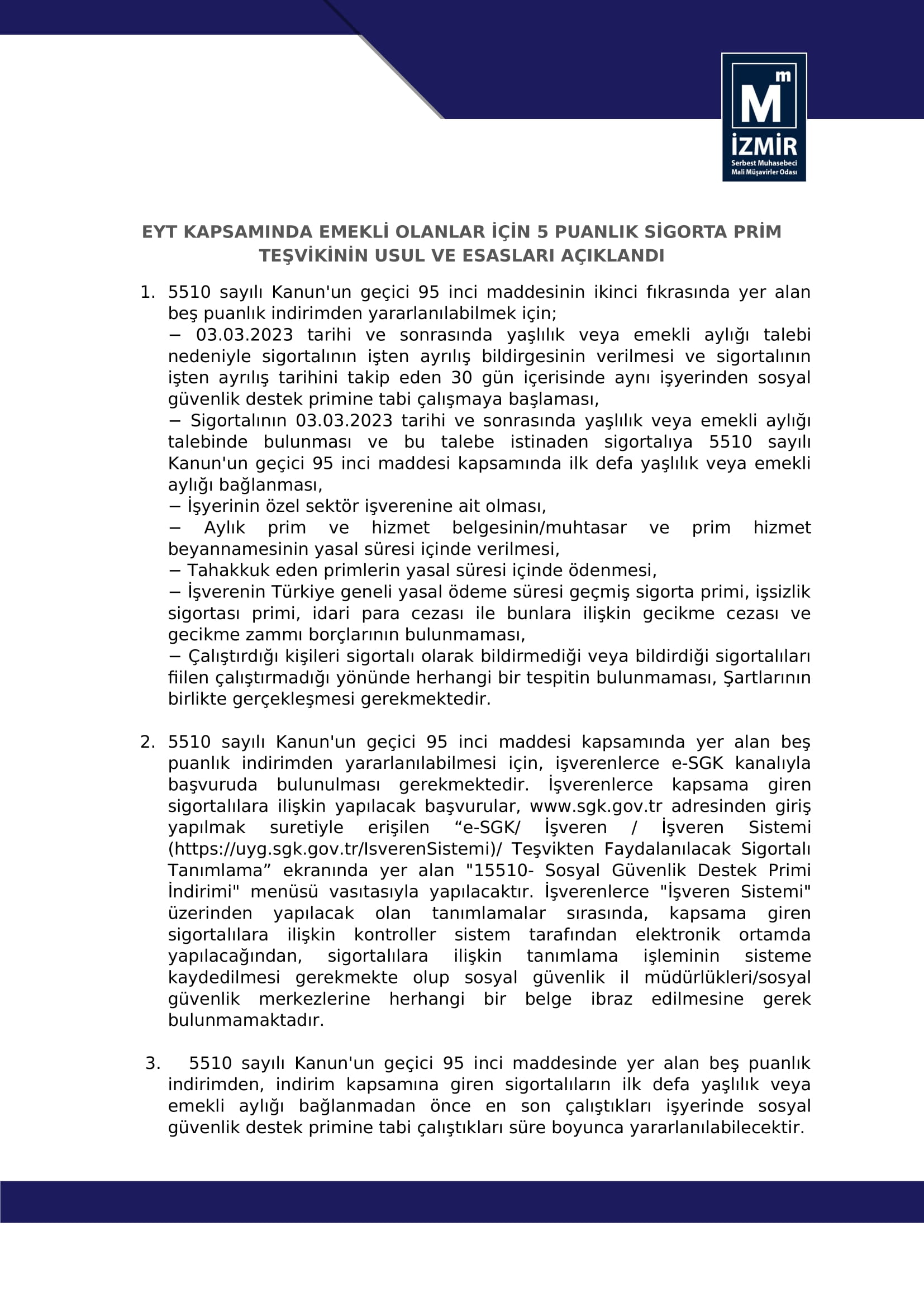 EYT Kapsamında Emekli Olanlar İçin 5 Puanlık Sigorta Prim Teşvikinin Usul Ve Esasları Açıklandı 24 Nisan 2023 Pazartesi1478 Konuyla ilgili TÜRMOB Sirküler için tıklayınız.Konuyla ilgili SGK Genelgesi için tıklayınız.