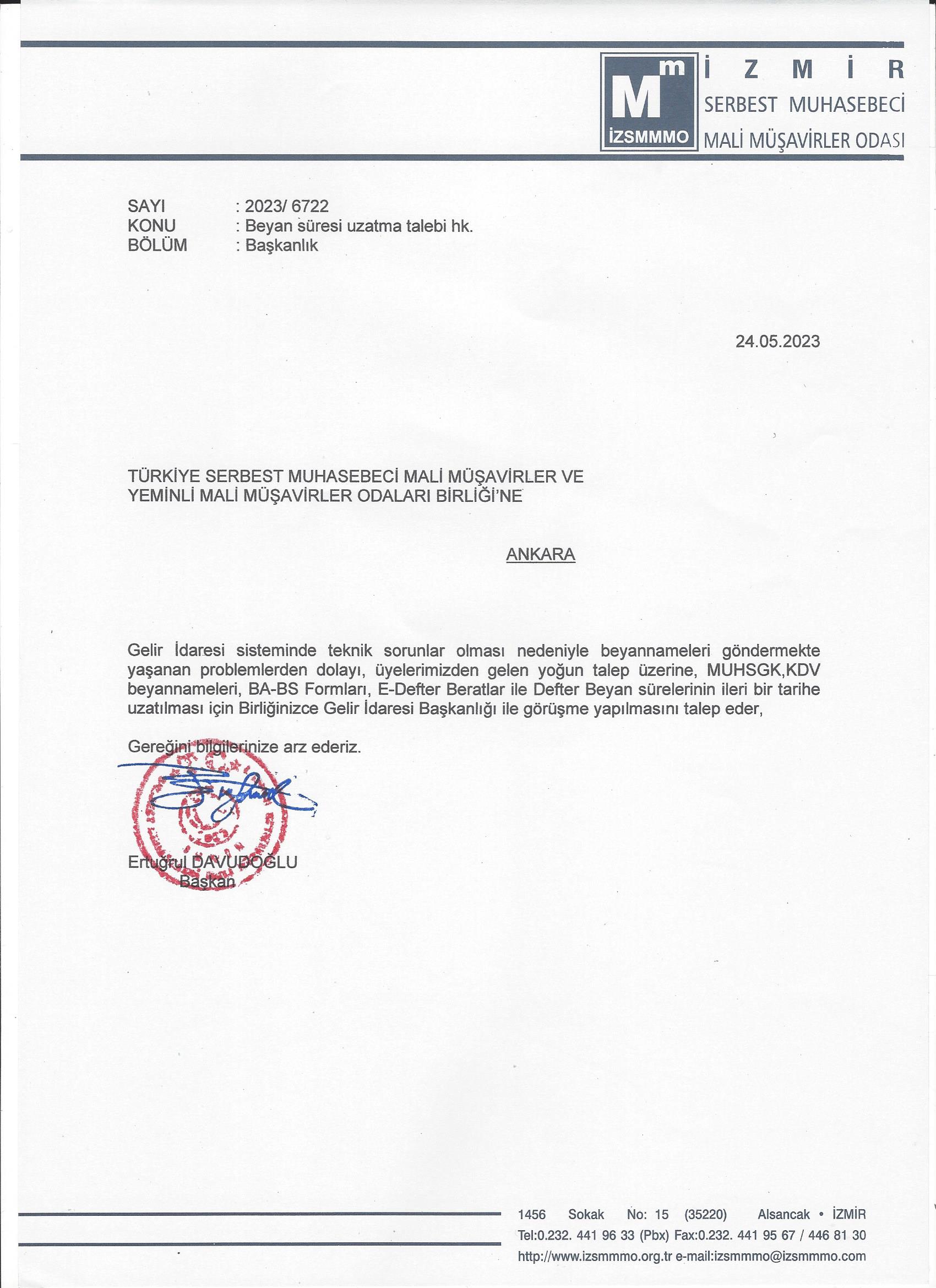 MUHSGK,KDV Beyannameleri, BA-BS Formları, E-Defter Beratlar ile Defter Beyan Süreleri Uzatma Talebi İle İlgili TÜRMOB'A Gönderilen Yazımız 24 Mayıs 2023 Çarşamba2468