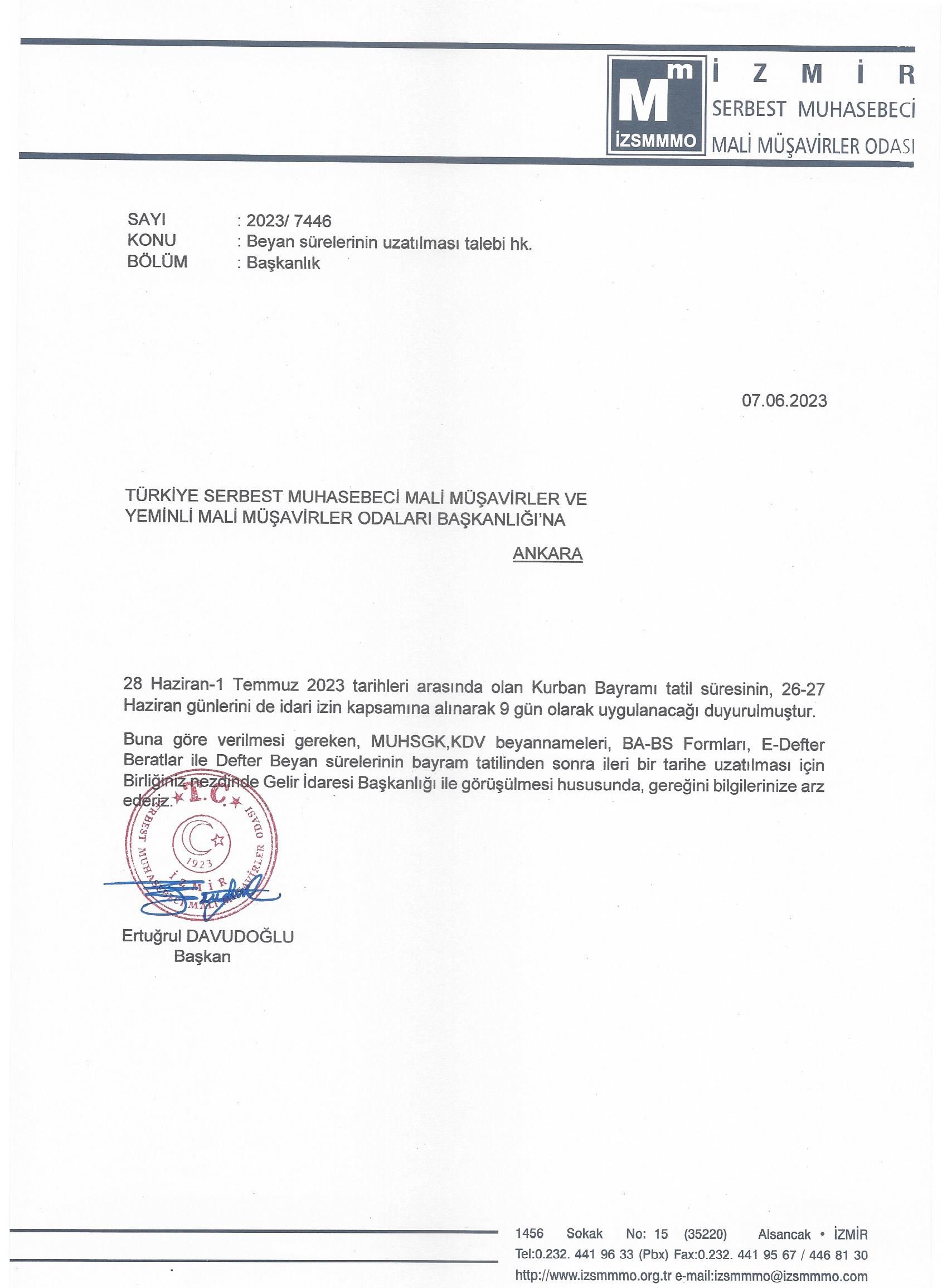 9 Günlük Bayram Tatili Dolasıyla Beyan Süreleri Uzatma Talebi İle İlgili Türmob'a Gönderilen Yazımız 7 Haziran 2023 Çarşamba2223