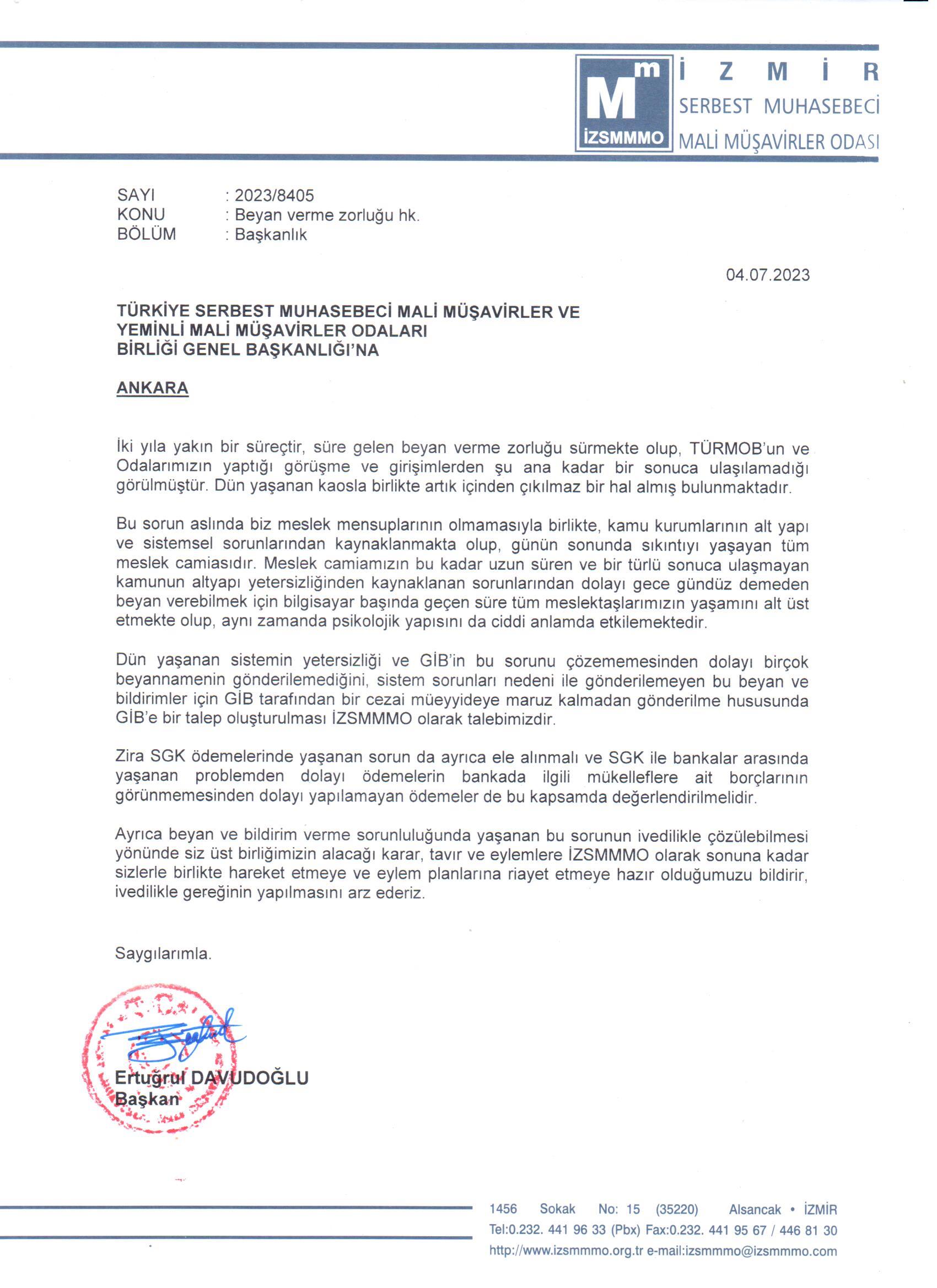 Beyan Verme Zorluğu Hakkında TÜRMOB'a Gönderdiğimiz Yazı