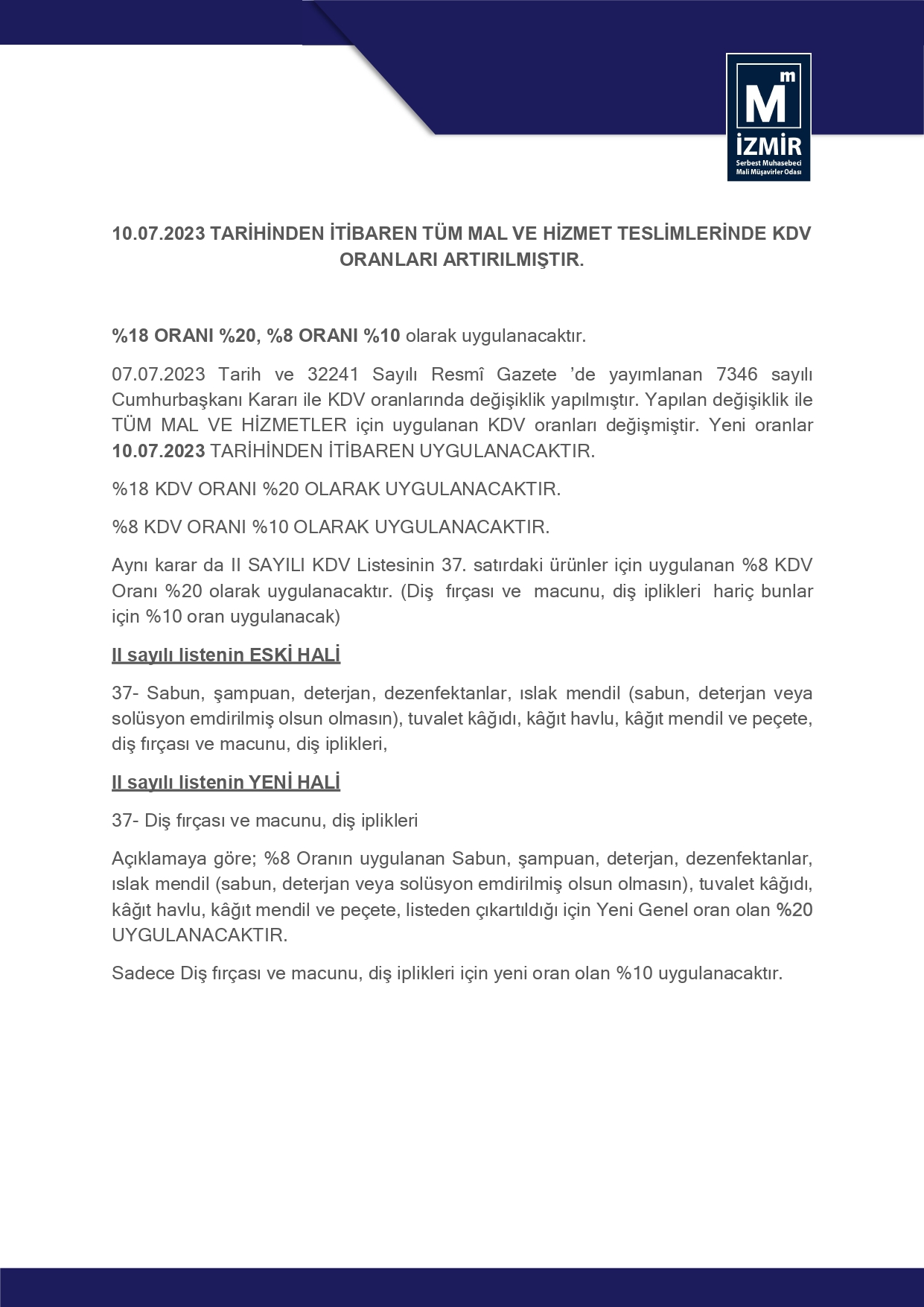 10.07.2023 Tarihinden İtibaren Tüm Mal ve Hizmet Teslimlerinde KDV Oranları Artırılmıştır. %18 Oranı %20, %8 Oranı %10 Olarak Uygulanacaktır. 7 Temmuz 2023 Cuma1831 –– Mal ve Hizmetlere Uygulanacak Katma Değer Vergisi Oranlarının Tespitine İlişkin Kararda Değişiklik Yapılmasına Dair Karar (Karar Sayısı: 7346)