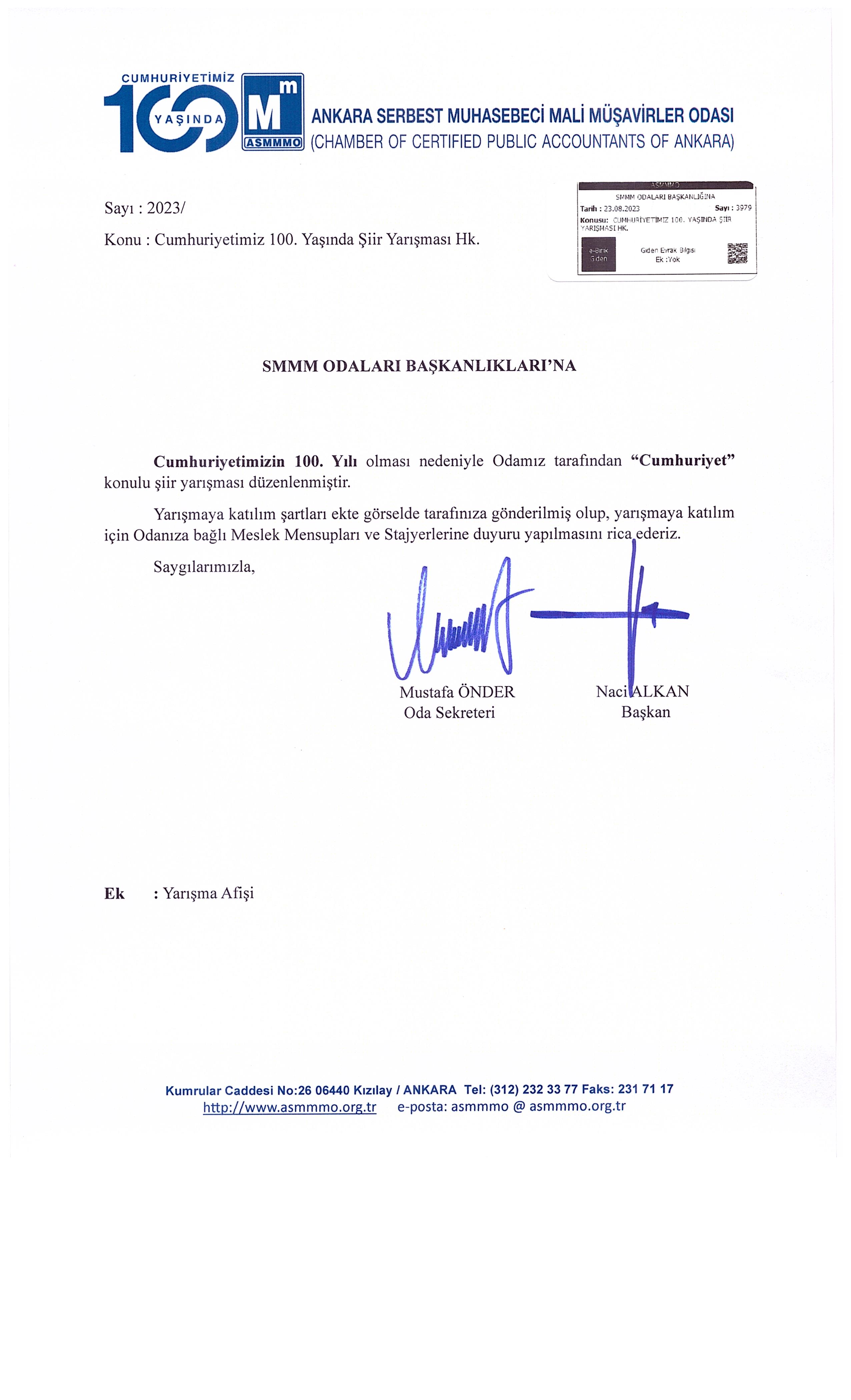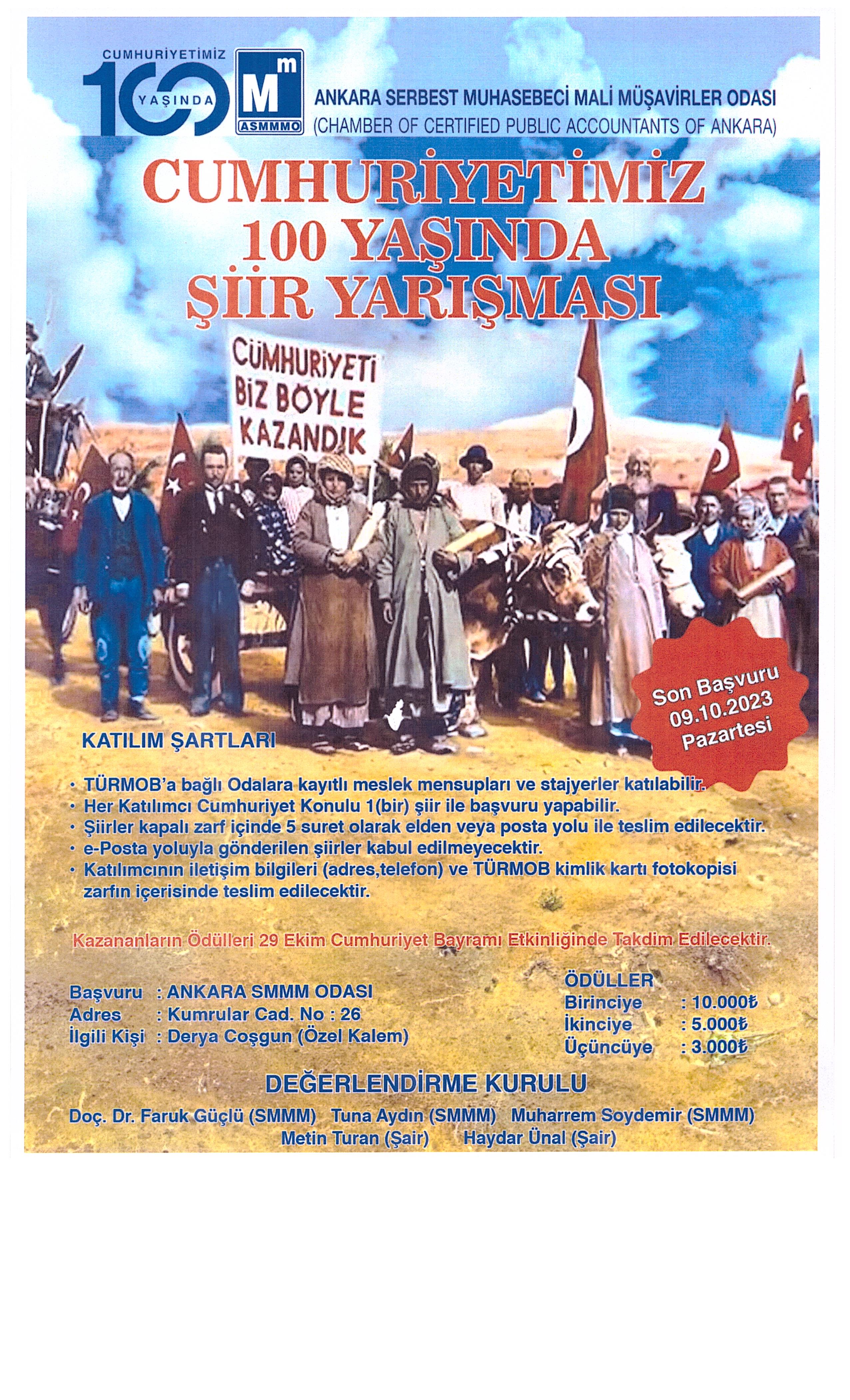 Ankara SMMM Odası tarafından “Cumhuriyet” konulu şiir yarışması düzenlenmiştir. Yarışmaya Odamız Üyeleri ve Stajyerleri Katılım Sağlayabilir. 29 Ağustos 2023 Salı1200