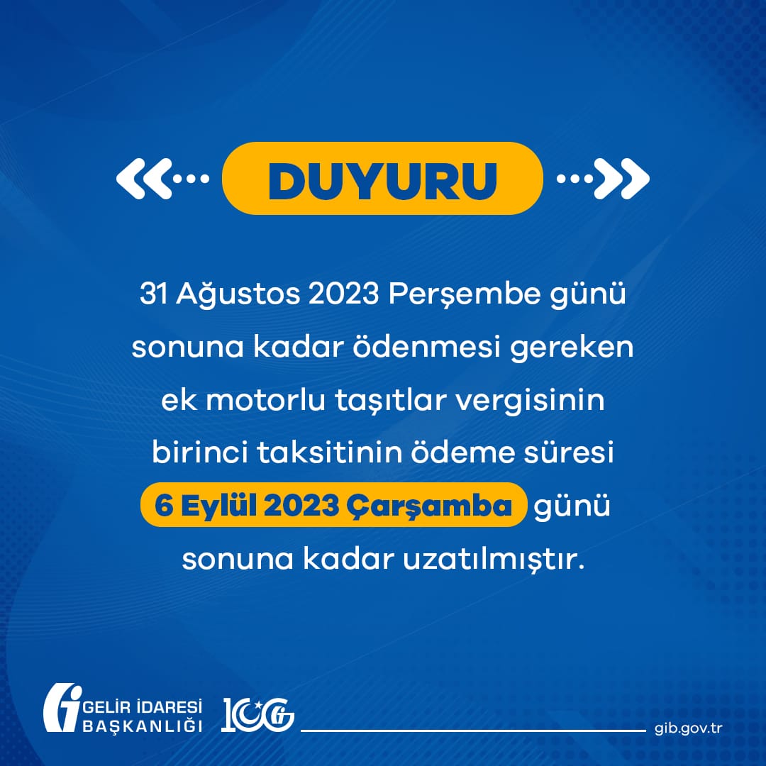 Ek Motorlu Taşıtlar Vergisinin Birinci Taksitinin Ödeme Süresi 6 Eylül 2023 Çarşamba Günü Sonuna Kadar Uzatılmıştır. 29 Ağustos 2023 Salı1255