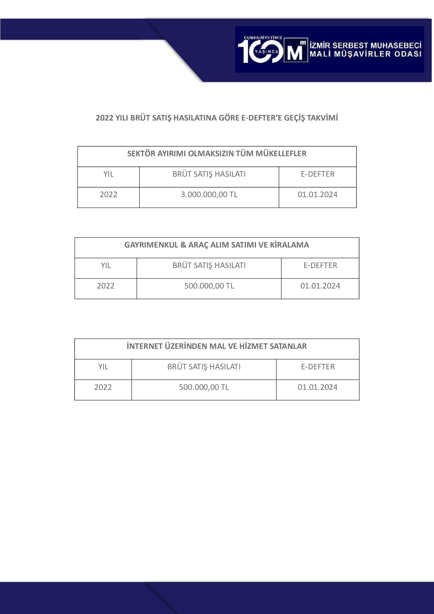 2022 Yılı Brüt Satış Hasılatına Göre E-Defter’e Geçiş Takvimi