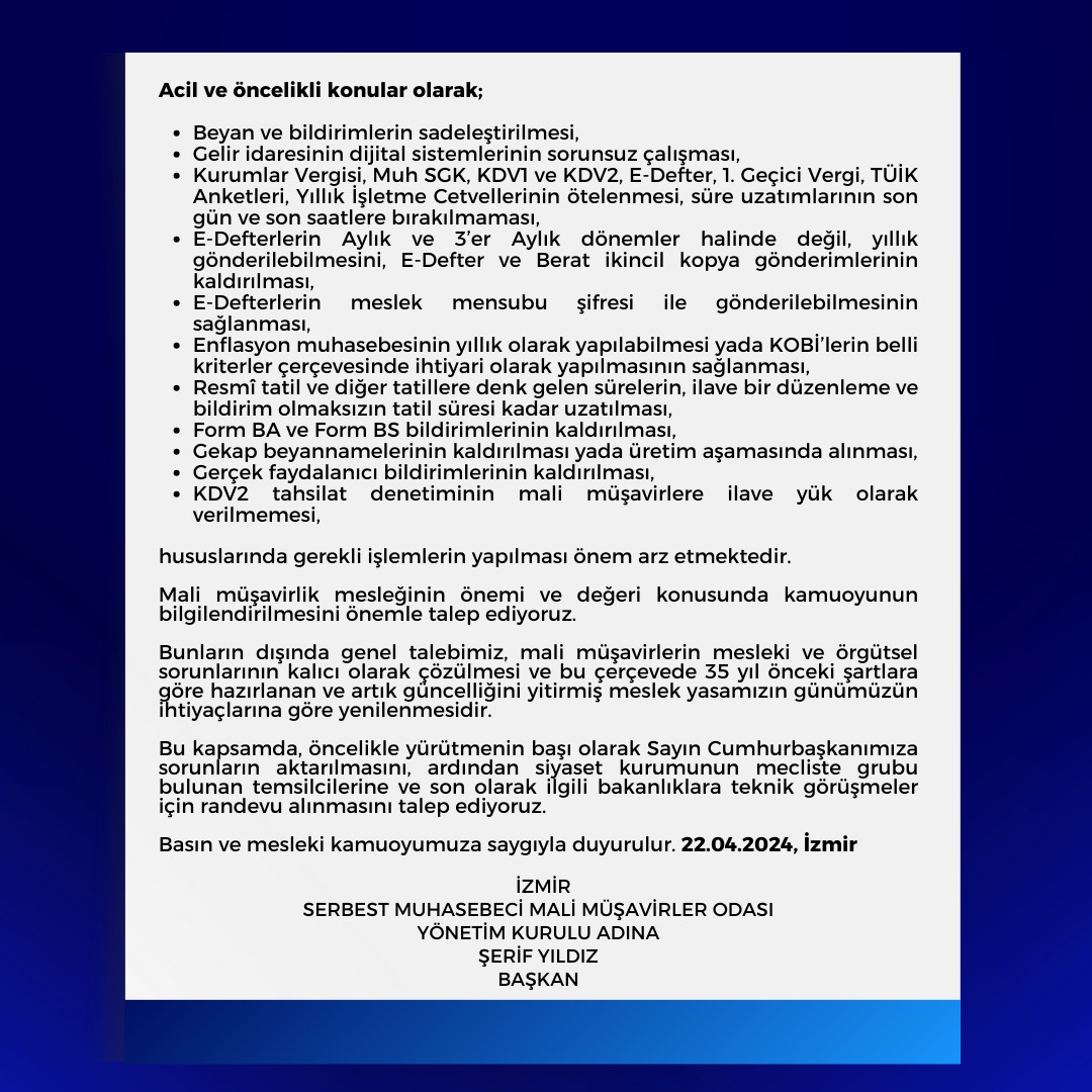 Güncel Mesleki Sorunlarımız İle İlgili İzmir Mali Müşavirler Odası Basın Bülteni 22 Nisan 2024 Pazartesi2915