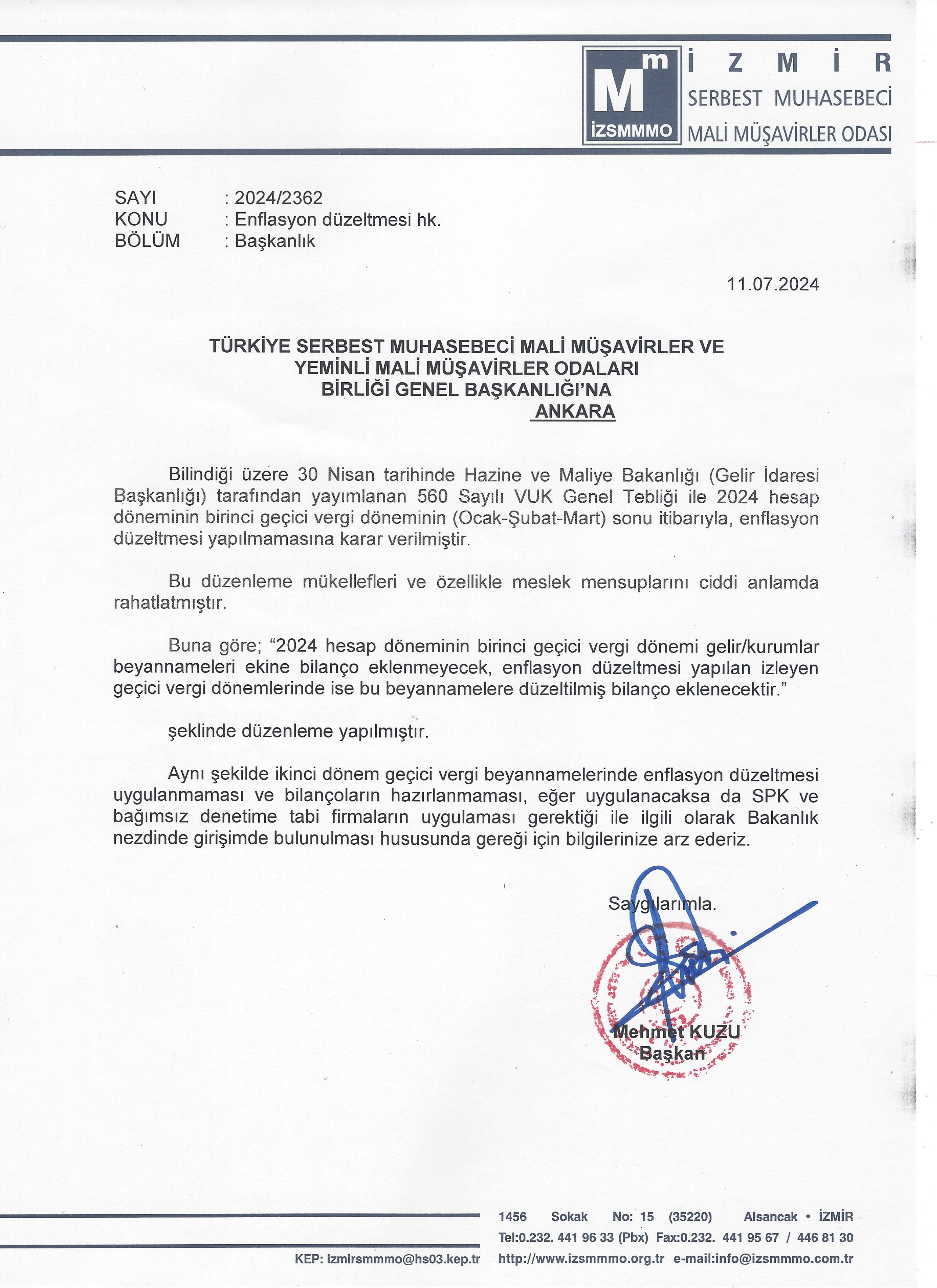 Enflasyon Düzeltmesinin 2024/2. Geçici Vergi Döneminde Uygulanmaması İle İlgili TÜRMOB'a Gönderdiğimiz Yazımız 11 Temmuz 2024 Perşembe2265