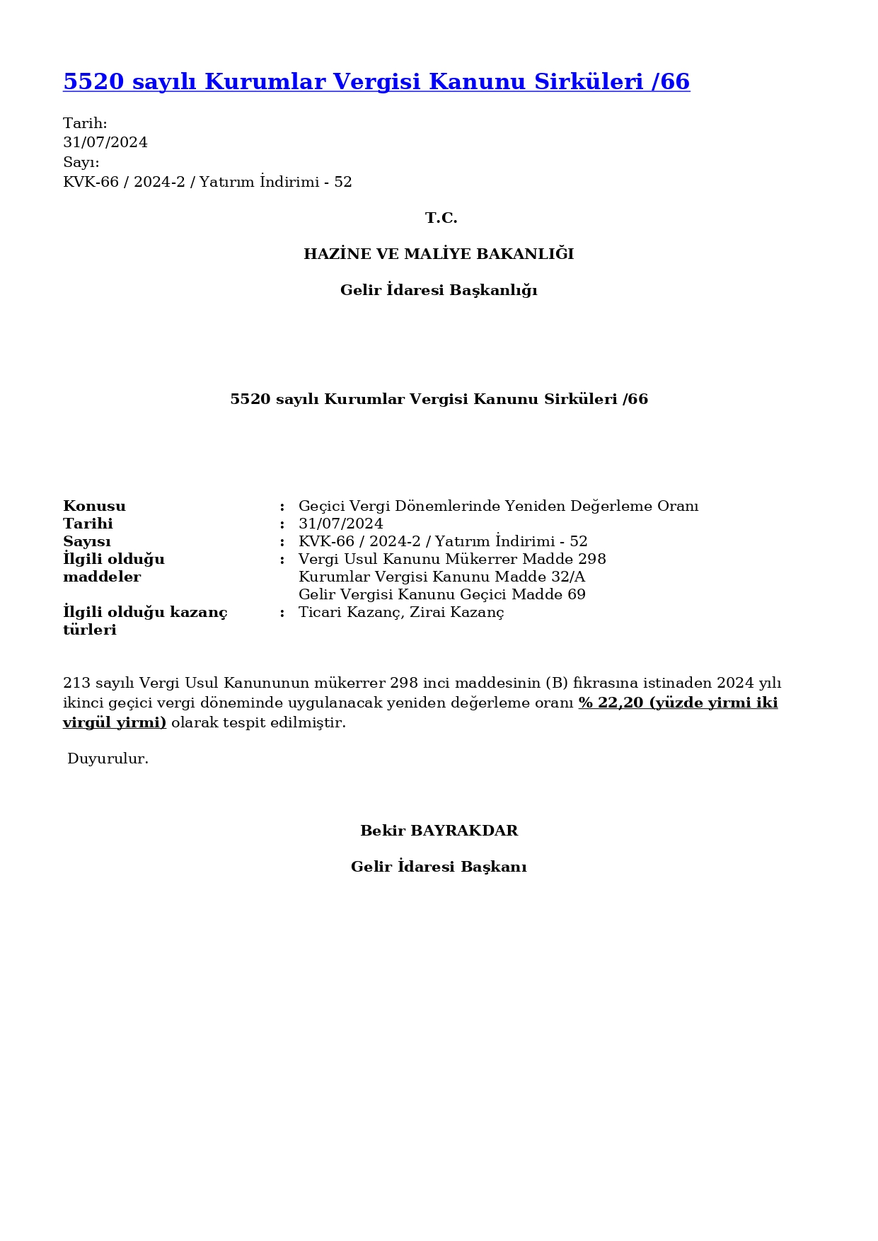 5520 sayılı Kurumlar Vergisi Kanunu Sirküleri /66 "2024 Yılı İkinci Geçici Vergi Döneminde Uygulanacak Yeniden Değerleme Oranına İlişkin Kurumlar Vergisi Sirküleri" 31 Temmuz 2024 Çarşamba1141