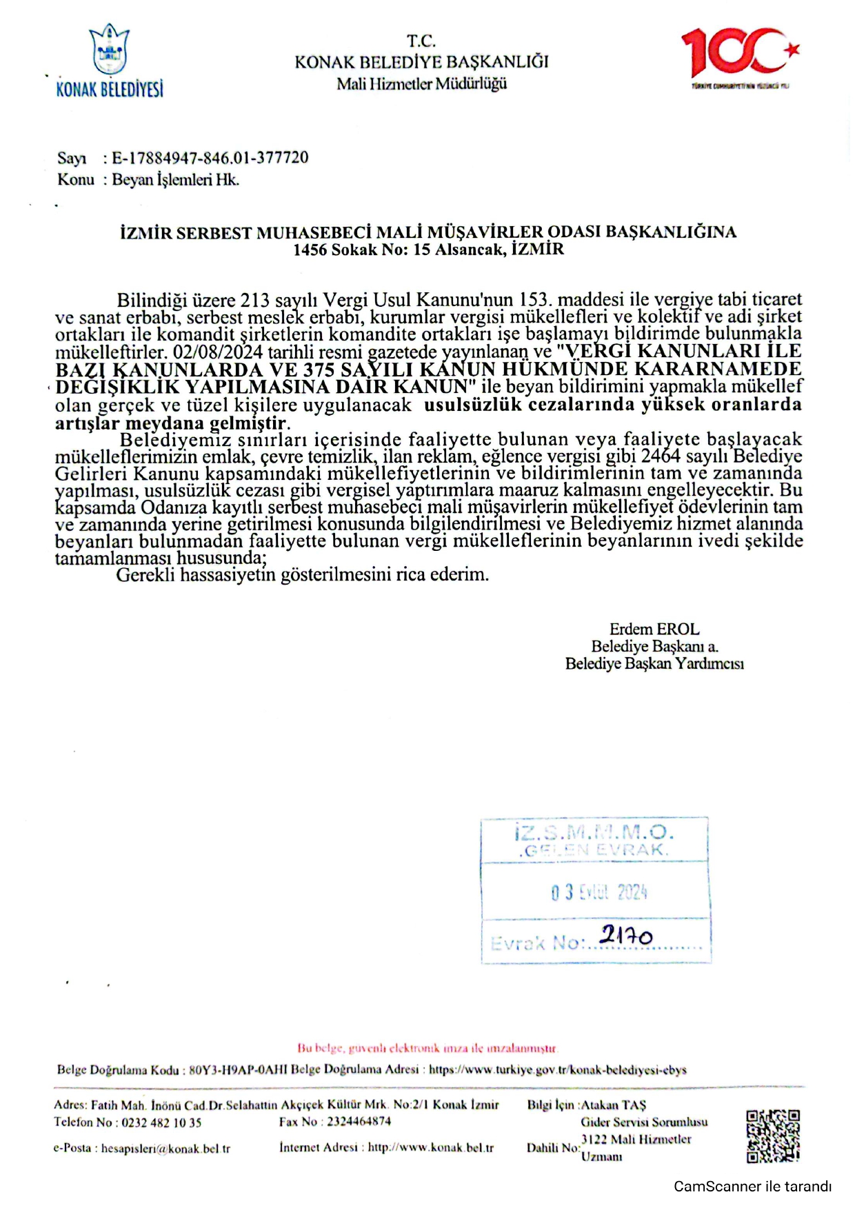 Konak Belediyesi Beyan İşlemleri Hakkında Yazı