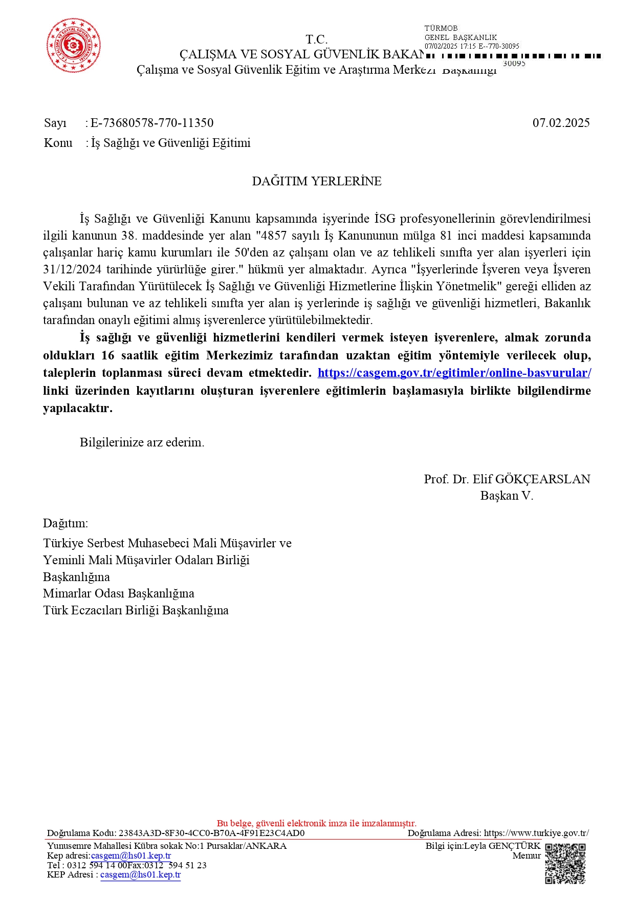 İş Sağlığı ve Güvenliği Eğitimlerine İlişkin Bakanlık Duyurusu 25 Şubat 2025 Salı1135 Kayıt linki: https://casgem.gov.tr/egitimler/online-basvurular/