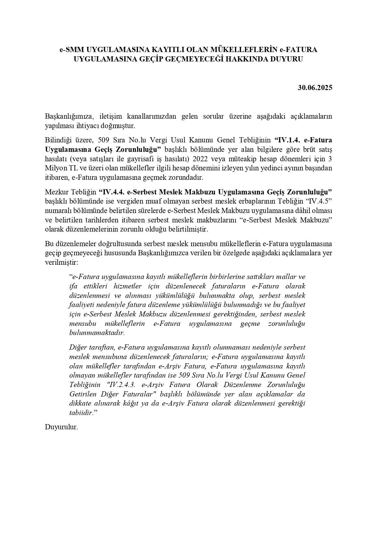 GİB Tarafından Yapılan Açıklamaya Göre Serbest Meslek Erbaplarının e-Fatura Geçiş Zorunluluğu BULUNMAMAKTADIR 30 Haziran 2025 Pazartesi1171 Kaynak:GİB