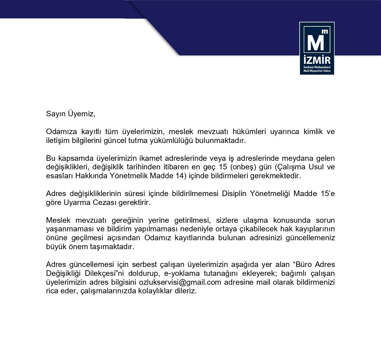 Adres Değişikliği Bildirimi İle İlgili Duyuru 1 Temmuz 2025 Salı3848 ODAMIZ KAYITLARINDAKİ MEVCUT ADRESİNİZDE BİR DEĞİŞİKLİK YOKSA BU BİLGİLENDİRMEYİ DİKKATE ALMAYINIZ.BİLDİRİM YAPMASI GEREKEN ÜYELERİMİZ ADRES DEĞİŞİKLİĞİ YAPMIŞ, ANCAK ODAMIZA BİLGİ VERMEMİŞ ÜYELERİMİZDİR. Büro adres değişikliği dilekçesi için tıklayınız.