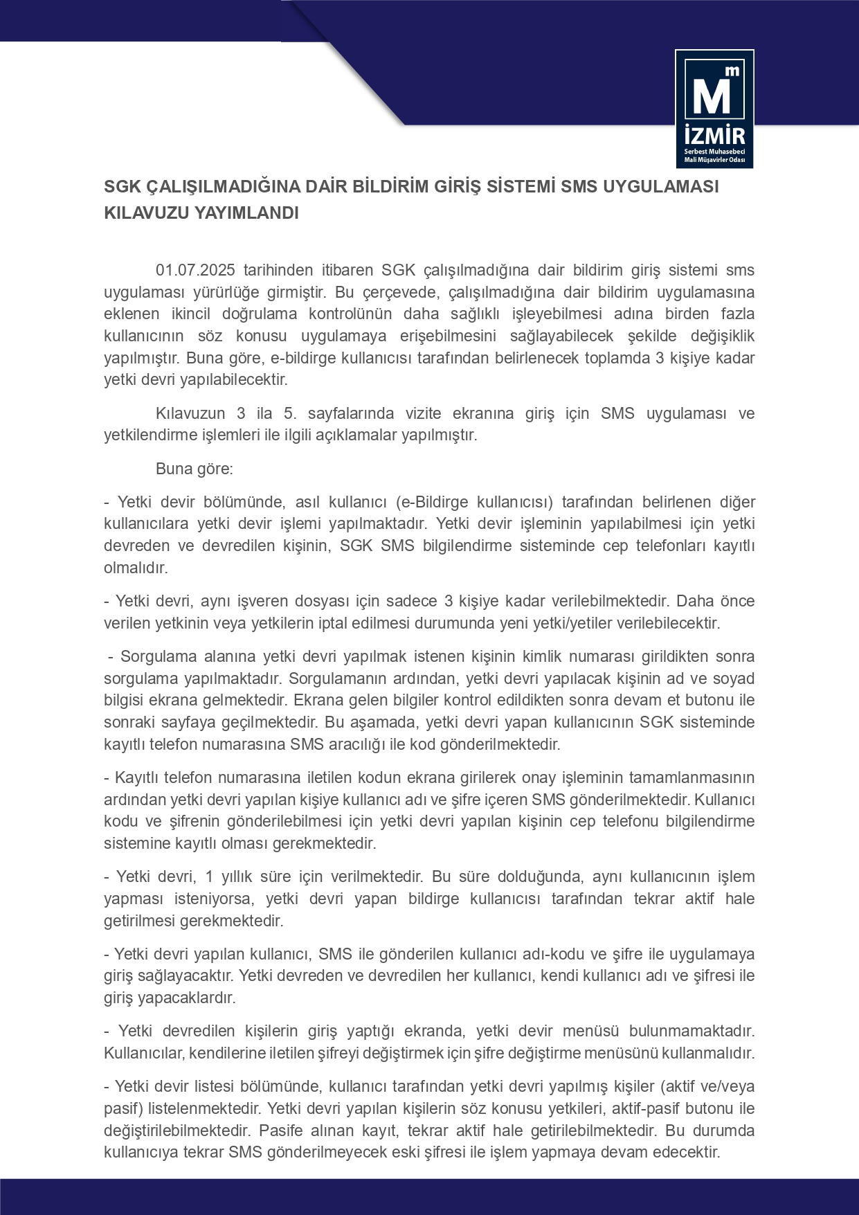 SGK Çalışılmadığına Dair Bildirim Giriş Sistemi SMS Uygulaması Kılavuzu Yayımlandı 3 Temmuz 2025 Perşembe1136 SGK Çalışılmadığına Dair Bildirim Giriş Sistemi SMS Uygulaması Kılavuzu için tıklayınız.