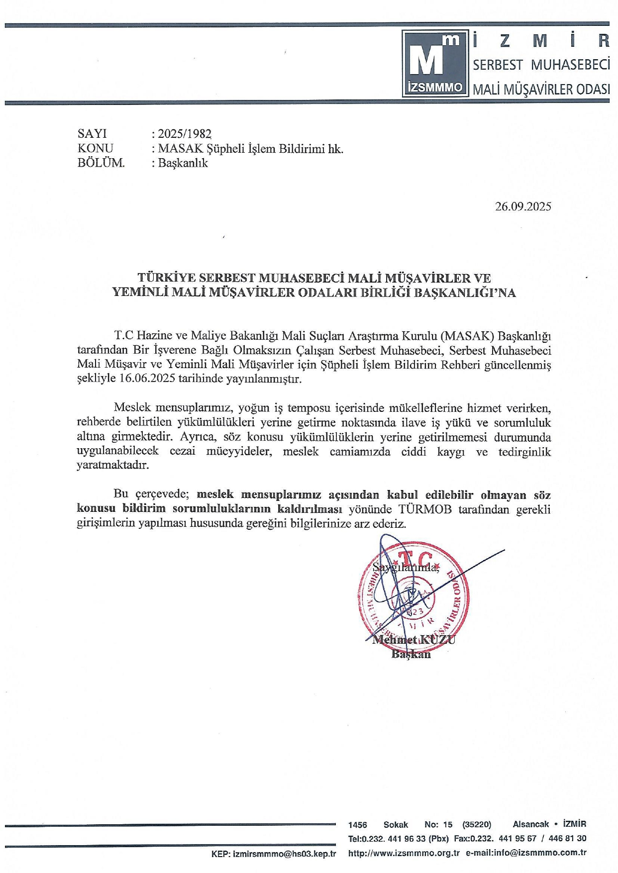 MASAK Şüpheli İşlem Bildirimi İle İlgili TÜRMOB'a Yazımız
