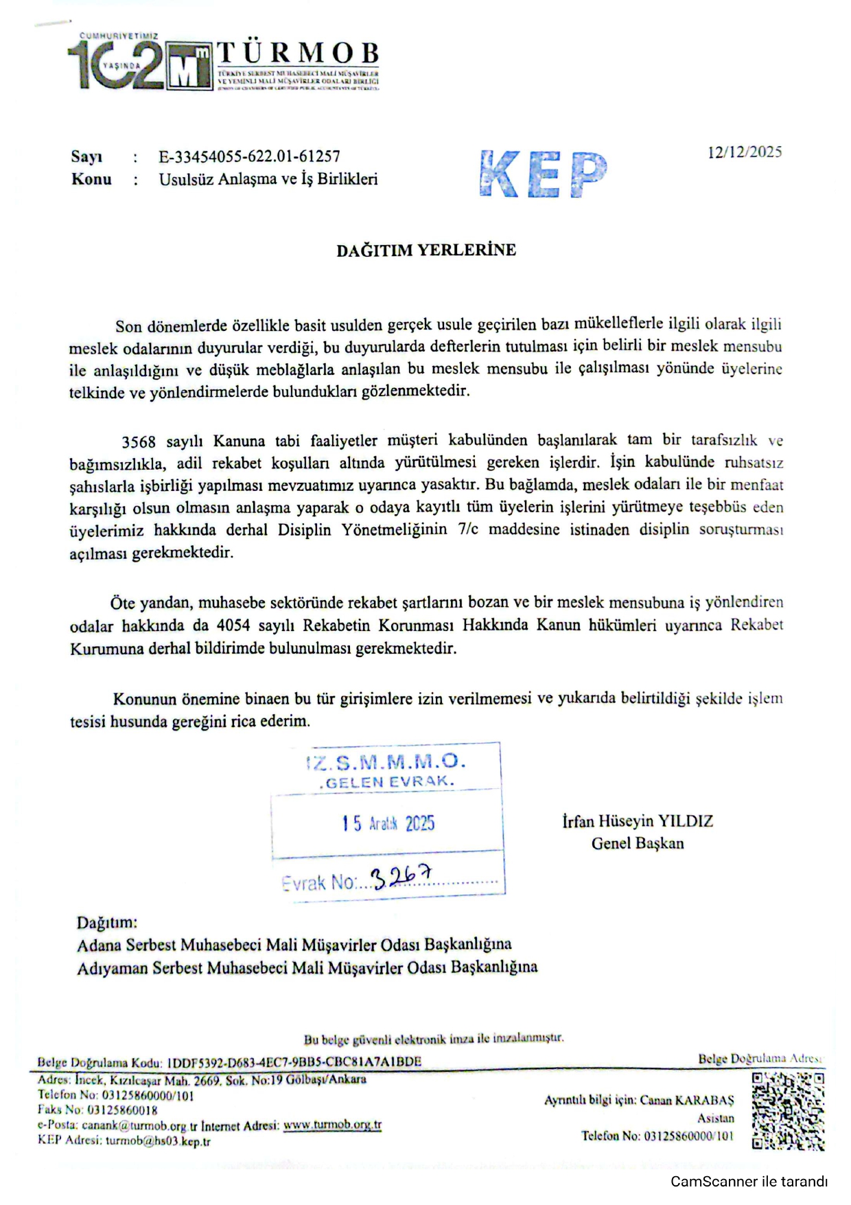 586 Sayılı VUK Genel Tebliği Düzenlemesi Sonucu Usulsüz Anlaşma ve İş Birlikleri Hakkında TÜRMOB Yazısı 15 Aralık 2025 Pazartesi537