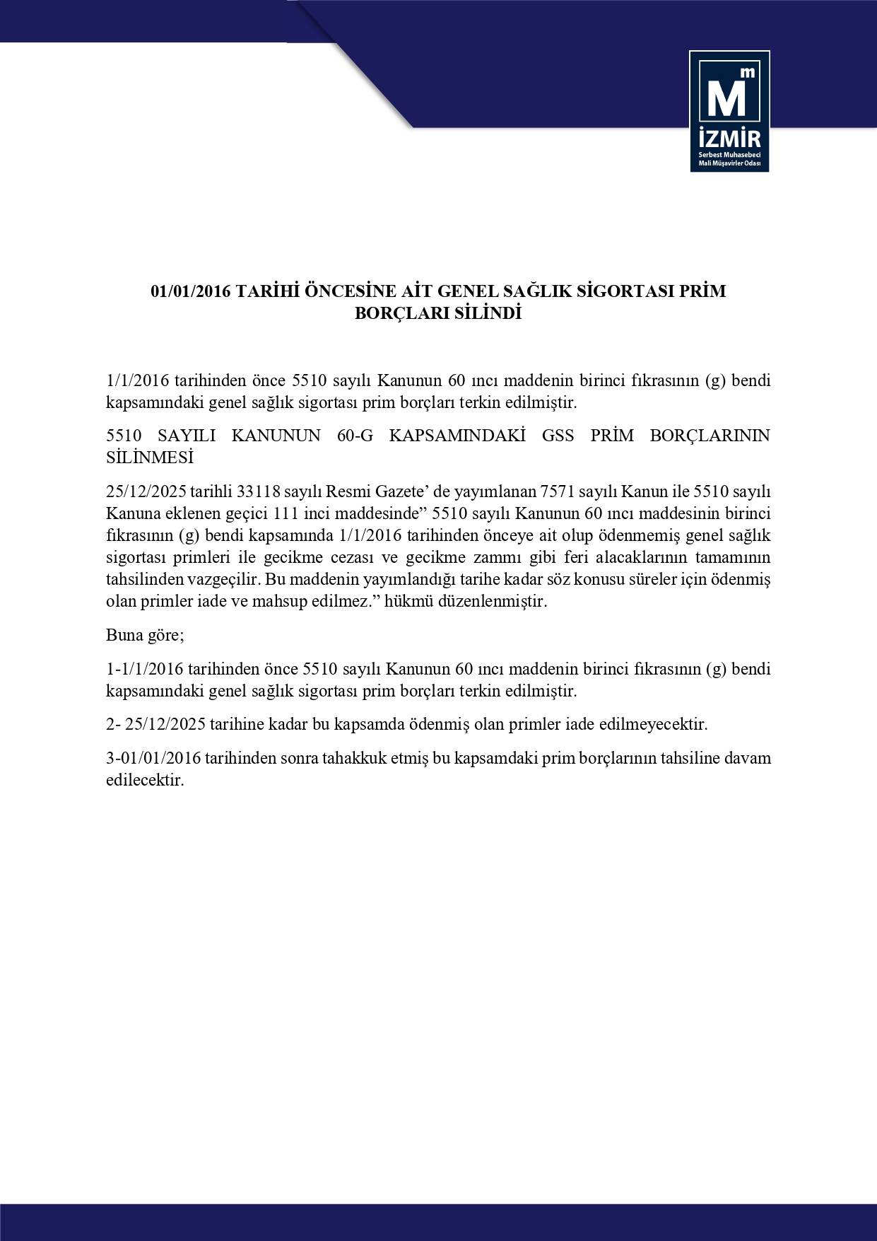 01/01/2016 Tarihi Öncesine Ait Genel Sağlık Sigortası Prim Borçları Silindi 31 Aralık 2025 Çarşamba180 7571 Türk Ceza Kanunu ile Bazı Kanunlarda ve 631 Sayılı Kanun Hükmünde Kararnamede Değişiklik Yapılmasına Dair Kanun