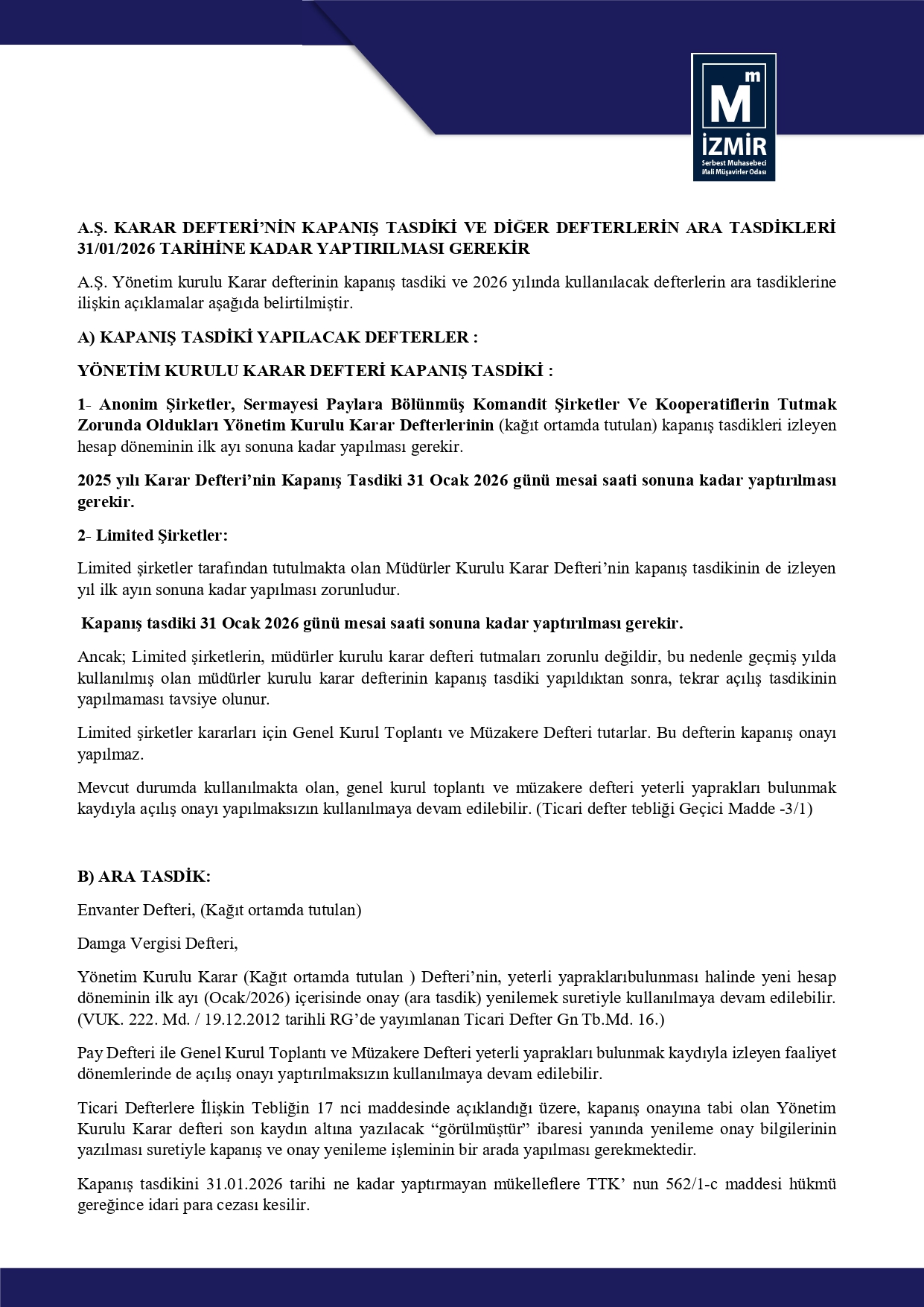 A.Ş. Karar Defteri’nin Kapanış Tasdiki Ve Diğer Defterlerin Ara Tasdikleri 31.01.2026 Tarihine Kadar Yaptırılması Gerekir 23 Ocak 2026 Cuma 411