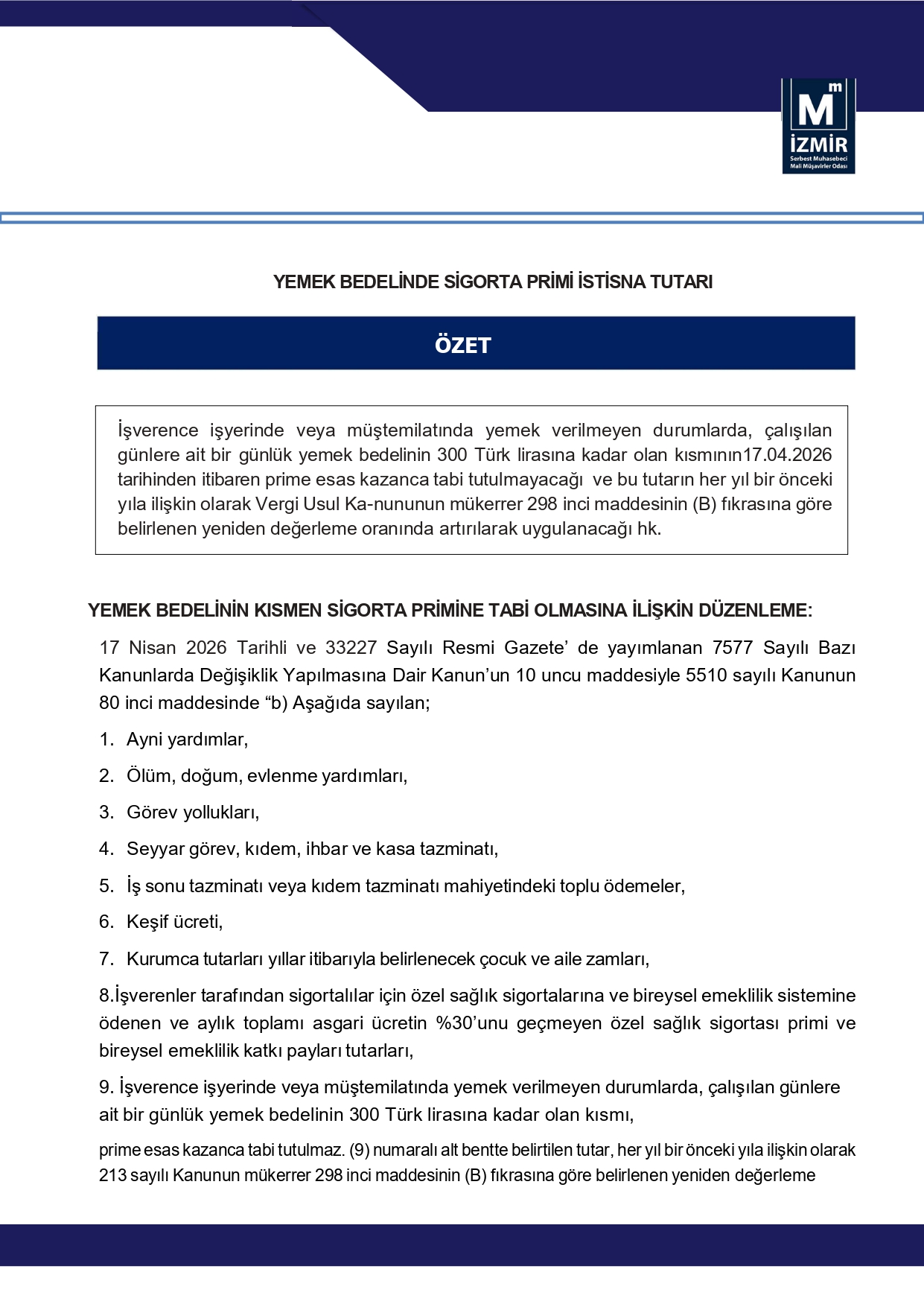 Yemek Bedelinde Sigorta Primi İstisna Tutarı 22 Nisan 2026 Çarşamba 21 17 Nisan 2026 Tarihli ve 33227 Sayılı Resmi Gazete Yayımlanan 7577 Sayılı Bazı KanunlardaDeğişiklik Yapılmasına Dair Kanun’un 10 uncu maddesi