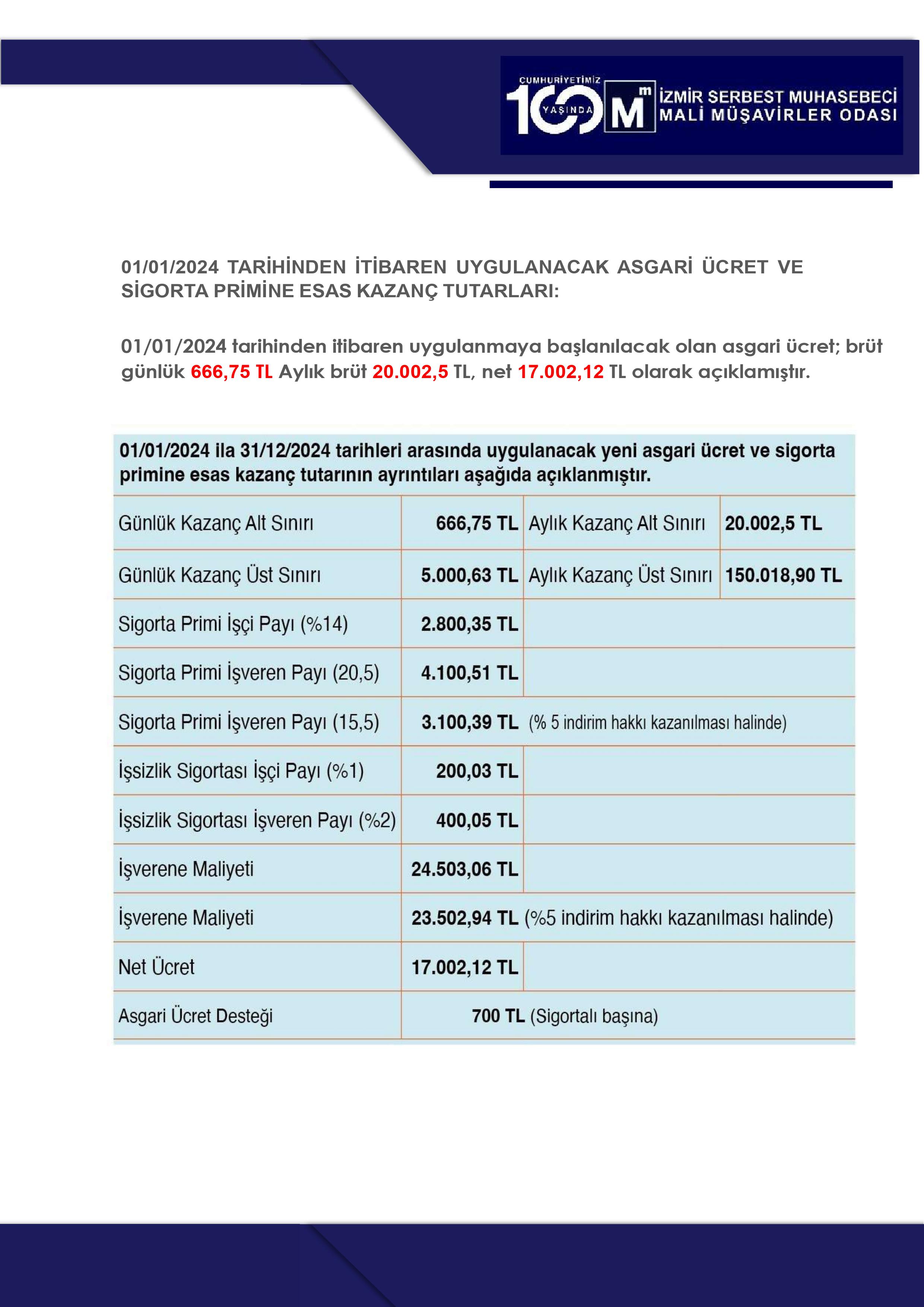 01.01.2024 Tarihinden İtibaren Uygulanacak Asgari Ücret ve Prime Esas Kazanç Tutarı Belli Oldu
