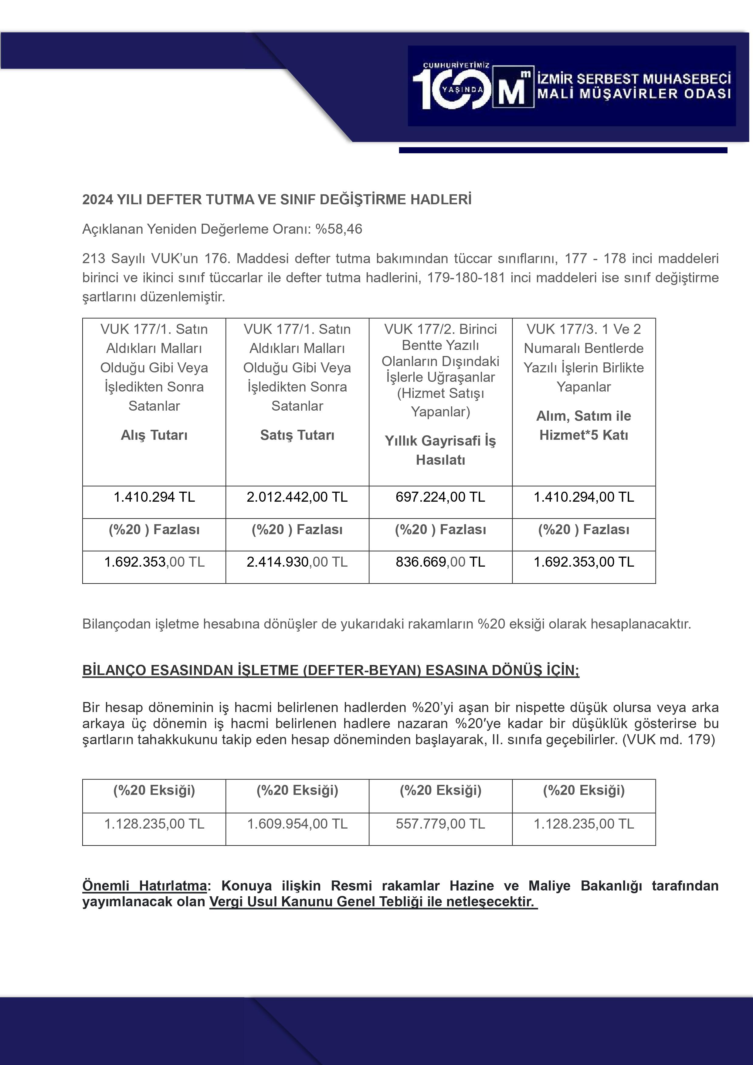2024 Yılı Defter Tutma ve Sınıf Değiştirme Hadleri