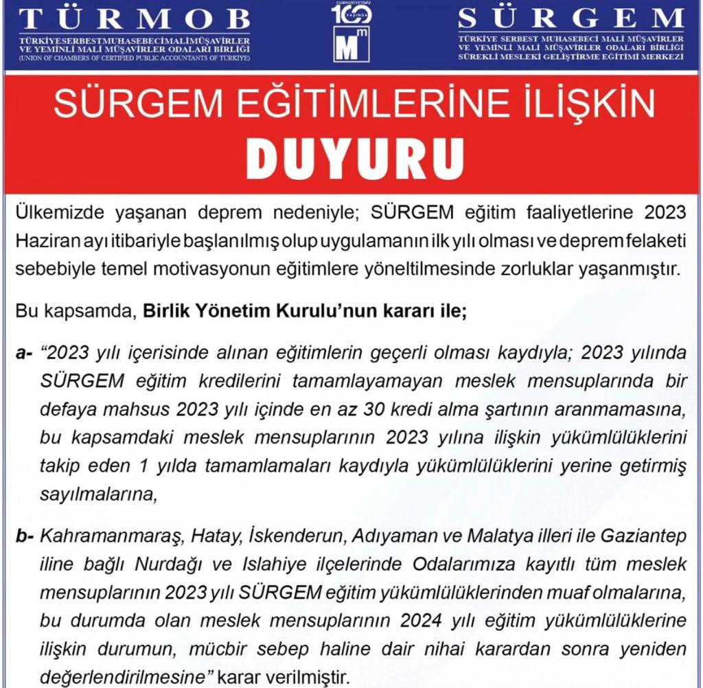 SÜRGEM Eğitimlerine İlişkin Süre Uzatımı Duyurusu