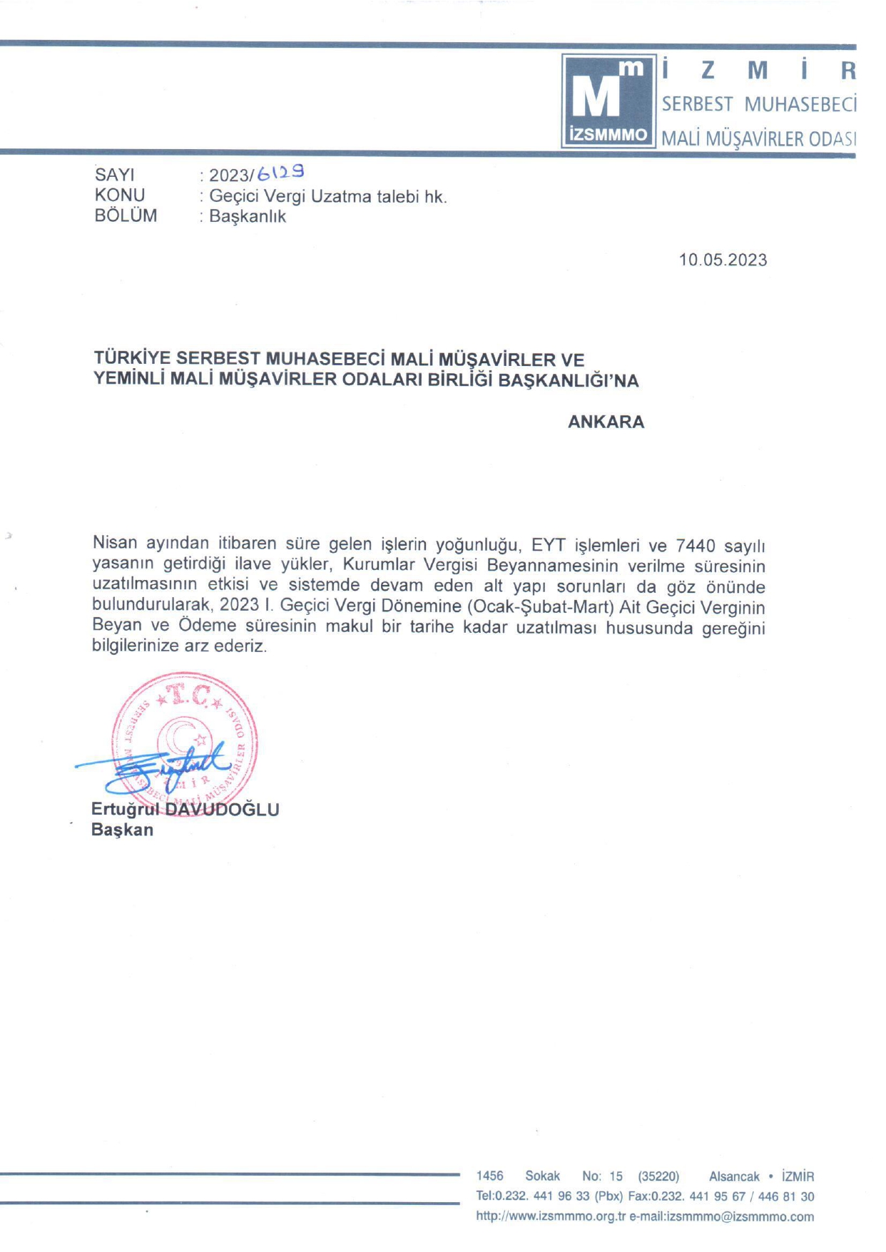 2023/1. Dönem Geçici Vergi Beyan ve Ödeme Süresinin Uzatılması İle İlgili TÜRMOB'a Gönderilen Yazımız