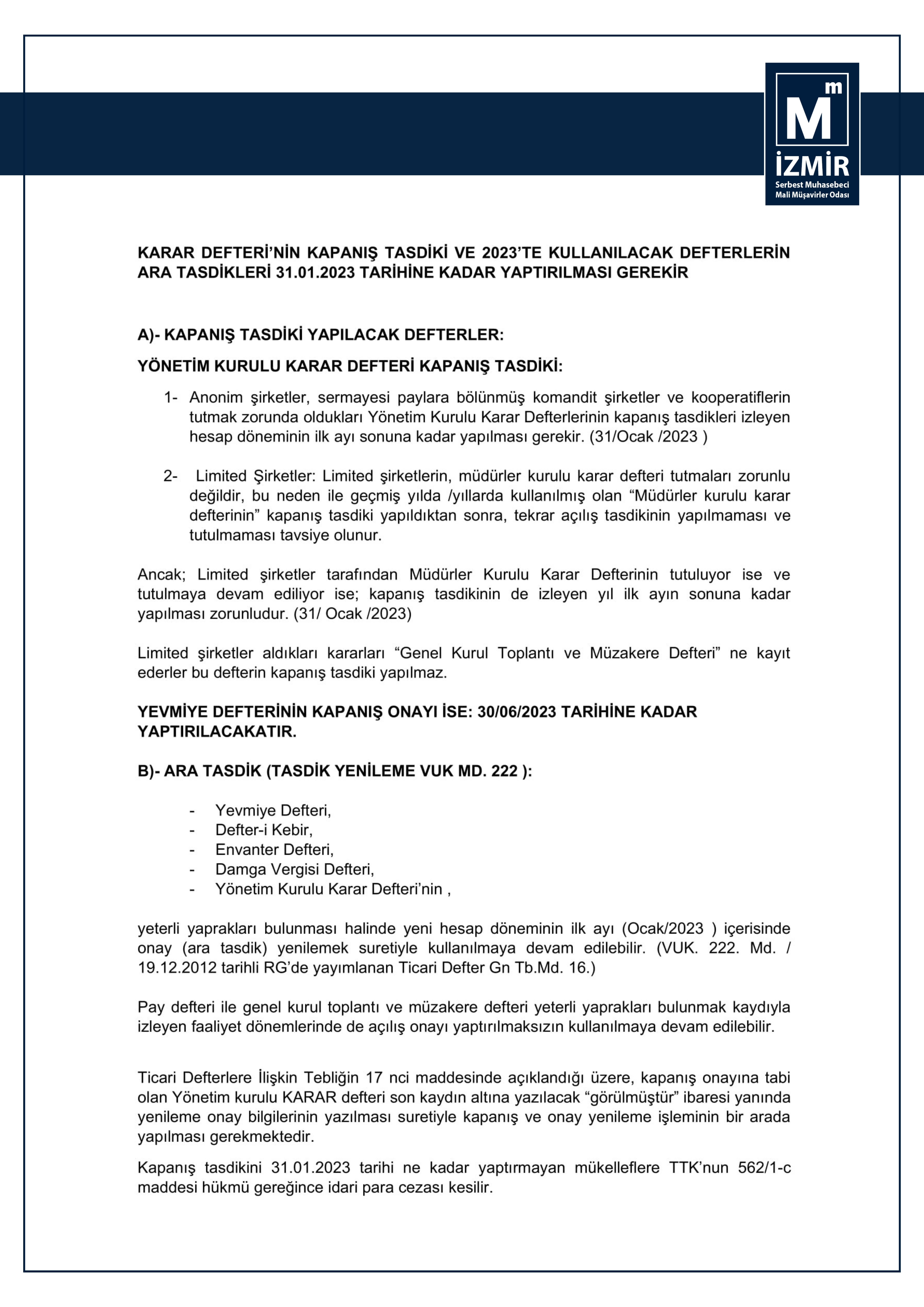 Karar Defteri Kapanış Tasdiki ve Ara Tasdiklerin 31.01.2023 Tarihine Kadar Yapılması Gerekir