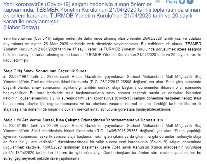 Yeni koronavirüs (Covid-19) salgını nedeniyle alınan önlemler kapsamında, TESMER Yönetim Kurulu’nun 21/04/2020 tarihli toplantısında alınan ek önlem kararları, TÜRMOB Yönetim Kurulu’nun 21/04/2020 tarih ve 20 sayılı kararı ile onaylanmıştır. 22 Nisan 2020 Çarşamba3143